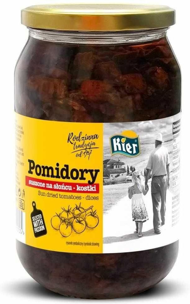 POMIDORY SUSZONE NA SŁOŃCU KOSTKA Produkt pasteryzowany. Masa netto: 980 g Masa po odsączeniu: 550 g Składniki: Pomidory suszone na słońcu (kostki), olej słonecznikowy, sól spożywcza, czosnek, kapary, tymianek, mięta, regulator kwasowości - kwas octowy i kwas cytrynowy, przeciwutleniacz - kwas …