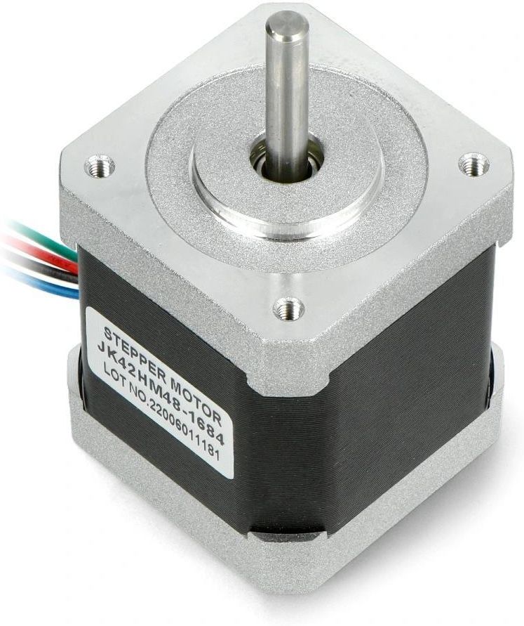 Silnik krokowy JK42HM48-1684 400 krok/obr 3,0V/1,68A/0,43Nm Silnik krokowy bipolarny, cztero przewodowy. Posiada rozdzielczość 400 kroków na obrót (0,9 stopnia). Zasilany jest napięciem 3,0 V, pobiera prąd 1680 mA na cewkę. Moment wynosi 4,4 kg*cm (0,43 Nm). Wymiary to 42 x 42 x 48 mm (NEMA 17). Indeks: MOT-03606 Specyfikacja silnika krokowego JK42HM48-1684 Rozdzielczość: 400 kroków/obr (0,9 °) Napięcie znamionowe: 3,0 V Pobór prądu na cewkę: 1,68 A Rezystancja cewki 1,65 Ω Indukcyjność uzwojenia: 4,1 mH Moment trzymający 4,4 kg*cm (0,43 Nm) Wyprowadzenia: bipolarne (cztery przewody) Średnica wału: 5 mm Masa: 350 g Standard: NEMA 17 Wymiary: 42 x 42 x 48 mm (bez wału) Rysunek techniczny i szczegółowe dane dostępne są w dokumentacji. Zdjęcia widoczne w galerii aukcji pochodzą od różnych Wystawiających. Jedynie zdjęcia zawarte w Opisie przedstawiają oferowany przez Nas produkt.