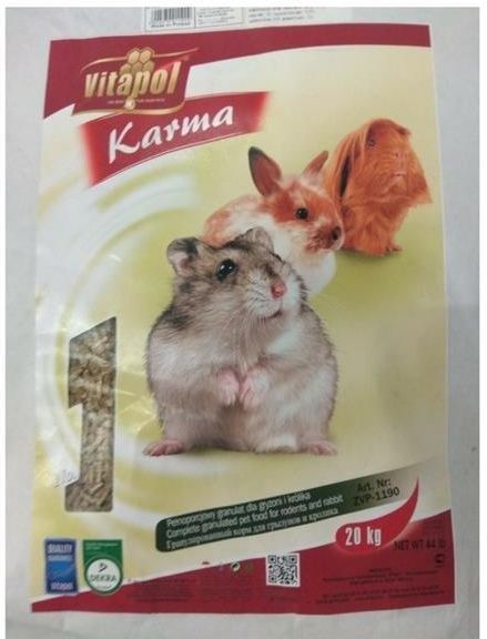 VITAPOL Karmeo pokarm granulowany dla gryzoni i królika 20kg Mieszanka paszowa pełnoporcjowa pełna niezbędnych dla organizmu składników pokarmowych. INFORMACJE O PRODUKCIE bogaty w białko, wysoka zawartość włókna, wzbogacony o witaminy, zawiera niezbędne minerały, VITAPOL Karmeo to pełnoporcjowy granulat stworzony z myślą o gryzoniach i królikach, który dostarcza niezbędnych składników pokarmowych potrzebnych do prawidłowego funkcjonowania organizmu Twojego pupila. Ten wyjątkowy pokarm granulowany jest wzbogacony wartościowymi witaminami, takimi jak witamina A, D3 i E, które wspierają zdrowie, odporność i wzrost Twojego zwierzaka. Dodatkowo, zawiera minerały, takie jak miedź, cynk, żelazo, mangan, selen i wapń, które są istotne dla utrzymania równowagi mineralnej i poprawnego funkcjonowania organizmu. Karmeo zapewnia również cenne białka, które są niezbędne dla wzrostu i regeneracji tkanek, oraz wysoką zawartość włókna, cowspomaga trawienie i utrzymanie zdrowej florę jelitową u Twojego zwierzaka. To nie tylko mieszanka paszowa pełnoporcjowa, ale również gwarancja, że Twojemu gryzoniowi lub królikowi nie zabraknie niczego, co jest mu potrzebne do zdrowego i aktywnego życia. Dzięki starannie dobranym składnikom, ten granulat pokarmowy jest doskonałym wyborem, który spełni wszystkie potrzeby żywieniowe Twojego pupila. Zapewnij swojemu zwierzakowi najwyższą jakość żywienia i zobacz, jak zachwycony będzie smakiem i korzyściami płynącymi z tego wyjątkowego pokarmu. DAWKOWANIE Podawać 2-3 razy dziennie według zapotrzebowania zwierzęcia. PRZEZNACZENIE Królik, świnka morska, chomik i inne gryzonie. Skład VITAPOL Karmeo - przetwory zbożowe, śruta lniana, śruta poekstrakcyjna z nasion słonecznikowa (25%), drożdże pastewne, fosforan jednowapniowy, węglan wapnia. Składniki analityczne VITAPOL Karmeo - białko surowe (ozn. Met. Kjeldahla) min. 14%, tłuszcz surowy min. 1,5%, włókno surowe max. 12,75%, popiół surowy max. 8,6%, wilgotność max. 12%. ID:41425