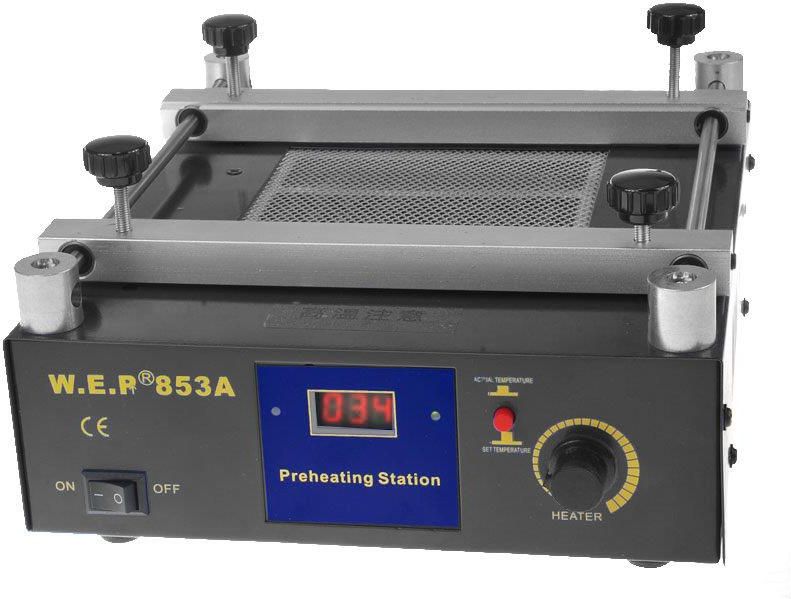 Podgrzewacz kwarcowy preheater WEP 853A infrared Stosowany w serwisie GSM PDA itp. Niezbędny przy lutowaniu bezołowiowym System ESD Safe Zakres temperatur: 0°C ~400°C Powierzchnia podgrzewania: 120x120mm Co w zestawie Preaheater WEP 853A Uchwyt regulowany na płozach Kabel zasilający Instrukcja obsługi 853AWEPBLACK cyfrowy odczyt temperatury (wyświetlacz pokazuje aktualną temperaturę podgrzewacza jak i temperaturę nastawioną) charakteryzuje się dużą powierzchnią grzewczą, oraz wygodnymi, wytrzymałymi uchwytami. płyta grzeje równomiernie na całej powierzchni, to zapobiega powstawaniu naprężeni na płycie PCB. Parametry techniczne Napięcie: 220-240 V Pobór mocy: 600W Zakres temperatur: 0°C ~400°C Element grzejny: kwarcowy Stabilność temperatury: ±1°C Powierzchnia podgrzewania: 120x120mm Wymiary uchwytu do płyt: 165x220mm Wymiary urządzenia: 220*247x73mm Wyświetlacz: LED Waga: ok. 4,5kg Preheater kwarcowy WEP 853A służy do wstępnego podgrzania płytki drukowanej przy użyciu szkła kwarcowego. Łagodne ogrzewanie przez kwarc płytki PCB zapobiega jej przegrzaniu i uszkodzeniu w dalszym procesie lutowania. Dzięki pomiarowi temperatury na bieżąco Preheater WEP 853A koryguje w czasie rzeczywistym minimalne wahania temperatury. Pracuje z dowolną stacją lutowniczą Hotair Na przednim panelu jest włącznik podgrzewacza. Pokrętła regulacji temperatury Wyświetlacz LED z wskazaniem aktualnej i zadanej temperatury Przełącznik temperatury rzeczywistej i nastawionej Pełna regulacja szerokości uchwytu płyty do 120mm Powierzchnia podgrzewania: 120x120mm UWAGA Jesteśmy wyłącznym przedstawicielem marki WEP na terenie polski dbamy o jakość sprzedawanych przez nas produktów. PODGRZEWACZE w ofercie WEP 853A 120x120mm 0-400°C 600W WEP 946D III 200x110mm 50°C~120°C 370W WEP 946M 300x400mm 0-400 °C 2500W Puhui T-8280 410x316mm 0-450 °C 1600W
