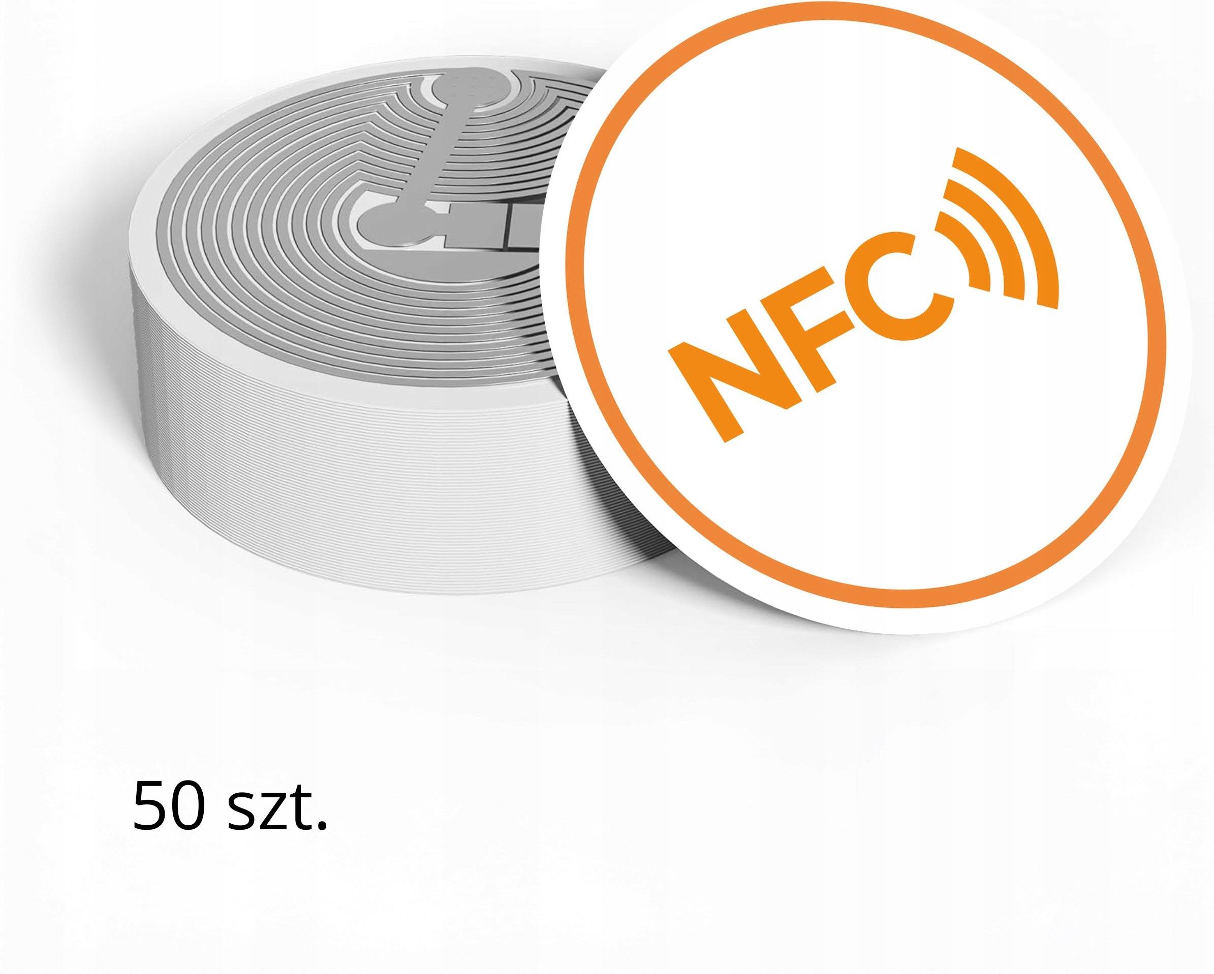 Tagi NFC naklejki okrągłe 25mm białe tło pomarańczowy napis 50 szt. Tychowo