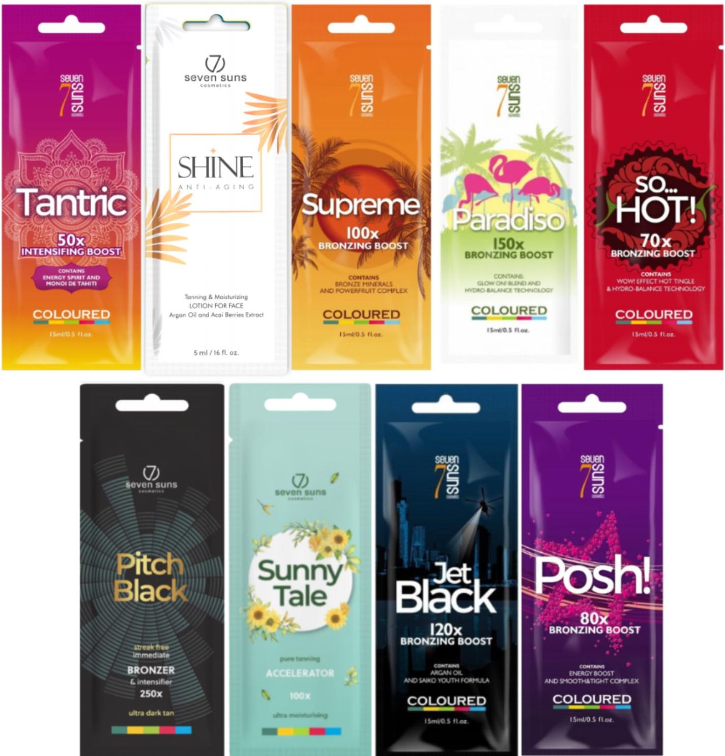 7suns Zestaw Saszetek Do Opalania x9szt7suns Tantric Przyspieszacz 15mlPrzyspieszacz opalania średniej mocy o orientalnym rodowodzie.Pamięć zapachowa pozwala ponownie przeżyć wspaniałe momenty z naszego życia. Dlaczego więc nie stworzyć kosmetyku, który nam w tym pomoże?Tantric jest jak pamiątka z dalekiej wyprawy. Przyspieszacz zniewala zapachem, a jednocześnie – nadaje skórze naturalnie złotego koloru.7suns Shine Rewitalizujące Serum Do Twarzy I OpalaniaShine– Rewitalizujące serum do codziennej pielęgnacji twarzy i opalania 5mlRewitalizujące połączenie ekskluzywnych składników: oleju arganowego, ekstraktu z jagód Acai oraz przeciwutleniaczy, przywraca skórze zdrowy i promienny wygląd. Pomaga redukować drobne zmarszczki i pobudza odnowę komórkową.Kluczowe składniki i korzyści:Olej arganowy – eliksir młodości: pielęgnuje, nawilża, uelastycznia, odżywia skórę, bogaty w antyoksydanty (m.in. witaminę E).Jagody Acai – chronią skórę przed działaniem wolnych rodników, wspomagają syntezę kolagenu.Witamina E – podstawowy antyoksydant, poprawia mikrocyrkulację krwi, ujędrnia skórę.Masło Shea – głęboko odżywia skórę i regeneruje ją, chroni przez wysoką temperaturą i wolnymi rodnikami.Wosk pszczeli – zapewnia efekt wygładzenia i odżywienia.Formuła HydroBalance – mieszanina składników silnie nawilżających, chroniących przed nadmierną utratą wody w skórze.Zapach: Słodki (Tahitian Palm Milk)Kolor masy: BiałyPojemność: 5m7suns Supreme Bronzer 15mlWyjątkowa kompozycja mocnych bronzerów oraz formuły Biotan, dodatkowo wzmocniona kompleksem Bronze Minerals – to gwarancja głębokiej, długotrwałej i naturalnie wyglądającej opalenizny.Pielęgnacja i ochrona skóryPoczuj moc owoców na swojej skórze kompleks Powerfruit nie tylko zwiększa efektywność opalania i przyspiesza regenerację skóry, ale także dodaje jej zdrowego blasku.7suns Paradiso Bronzer 15mlBronzer do solarium zawierający DHA oraz kompleks przyspieszający proces melanogenzey, zapewniający długotrwałą i naturalną opaleniznę.Kosmetyk bogaty w składniki odżywcze, gwarantuje natychmiastową, równomierną, głęboką i długotrwałą opaleniznę.7suns so… HOT! Tingle Bronzer 15mlWystrzałowe połączenie Delayed Bronzers i kompozycji WOW! effect Hot Tingle (m.in. cayenne i czarny pieprz) to obietnica idealnie ciemnego i równomiernego koloru.Pielęgnacja i ochronaZastosowana technologia Hydro-balance i dodatek aloesu to kojący kompres, który zagwarantuje optymalny poziom nawilżenia i szybką regenerację.7suns Posh! x80 Bronzer Do Opalania 15mlUnikalna kompozycja erytrulozy i Immediate Bronzers, wzmocniona formułą przyspieszającą opalanie Biotan – dla intensywnego koloru, bez smug i przebarwień.Pielęgnacja i ochrona skórySmooth&Tight to nowy kompleks ujędrniający, który wspomoże Twoją walkę z cellulitem i wzmocni strukturę skóry i poprawi jej elastyczność, a Energy Spirit sprawi, że będzie idealnie napięta i gładka.7suns Pitch Black 250x Mocny Bronzer 15mlDzięki wysokiej zawartości bronzerów natychmiastowych Pitch Black pozwala cieszyć się głębokim brązem od razu po zastosowaniu. Olej buriti to najbogatszy w beta-karoten i witaminę A znany olej, pozwalający na osiągnięcie głębszego i jeszcze trwalszego odcienia. Uzyskanie natychmiastowej opalenizny umożliwia dodatkowo olej z korzenia marchwi.7suns Sunny Tale Przyspieszacz Do Opalania 15mlNiczym poranne promienie słońca – przyspieszacz opalania SunnyTale sprawi, że subtelna opalenizna pokryje Twoją nawilżoną skórę złocistym blaskiem jeszcze szybciej, aktywnie pobudzając proces pigmentacji. A do tego – energetyzujący ekstrakt z guarany wspomoże redukcję cellulitu, przywracając młodzieńczą elastyczność. Dzięki mocy tajemniczego hibiskusa, nawet delikatna skóra zachowa zdrową kondycję, a olej z dzikiej róży zatroszczy się o wygładzenie zmarszczek, jednocześnie skutecznie zapobiegając utracie wody.7suns Jet Black Bronzer x120 Do Opalania 15mlNiesamowicie efektywna kompozycja Immediate i Delayed Bronzers wzmocniona przyspieszającą opalanie Biotan-em, aby Twoja opalenizna była naprawdę efektowna.Pielęgnacja i ochrona skóryZawiera Saiko Youth – naturalną formułę młodości, która wyraźnie poprawia kondycję skóry i przeciwdziała fotostarzeniu.
