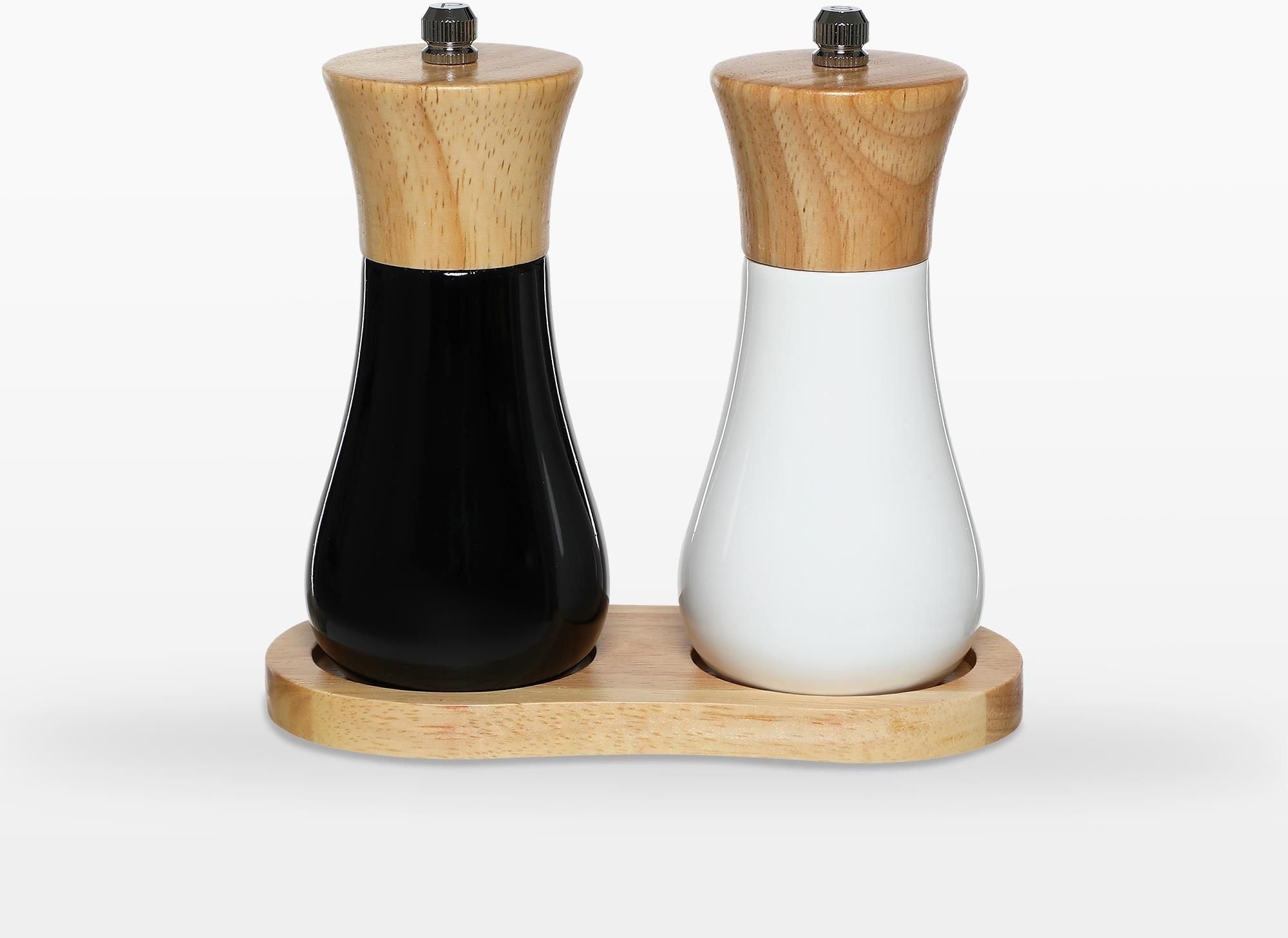 Urządzasz kuchnię i szukasz modnych dodatków do swojego wnętrza? Przedstawiamy Ci zestaw młynków do soli i pieprzu wykonanych między innymi z drewna kauczukowego — całość prezentuje się niezwykle stylowo i stanie się centralnym akcentem w Twojej kuchni. Wymiary zestawu: Młynek: 6 x14 cm Podstawa: 14 x 7 cm Podstawa i młynki wykonane z drewna kauczukowego cechują się trwałością i ponadczasowym wyglądem. Ceramiczny mechanizm mielący jest niezwykle precyzyjny – nie miażdży kryształków soli czy ziaren pieprzu, tylko je rozdrabnia. Płynna regulacja grubości mielenia pozwoli Ci osiągnąć takie efekty, jakich oczekujesz.Twoje dania zawsze będą doskonale doprawione! Czarny i biały kolor pomoże Ci odróżniać zawartość młynków. Młynki posiadają oznaczenia (S i P) na nakrętkach, które umożliwiają szybką ocenę zwartości.