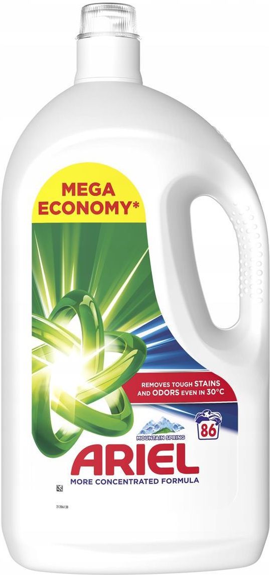 Ariel Płyn do prania, 86 prań, Mountain Spring Marka Ariel, rekomendowana przez Whirlpool, Candy, Beko i Electrolux, przedstawia płyn do prania Ariel Mountain Spring. USUWANIE UPORCZYWYCH PLAM I NIEPRZYJEMNYCH ZAPACHÓW Płyn do prania Ariel usuwa uporczywe plamy i nieprzyjemne zapachy nawet w temperaturze 30°C DOSKONAŁE REZULTATY NAWET W ZIMNEJ WODZIE Jego formuła została opracowana specjalnie z myślą o praniu w niższych temperaturach i krótkich cyklach. MARKA NAJCZĘŚCIEJ POLECANA PRZEZ WIODĄCYCH PRODUCENTÓW PRALEK W EUROPIE* Ariel rekomendowany jest przez Whirlpool, Electrolux, Candy i Beko *Producenci pralek polecają Ariel częściej niż jakąkolwiek inną markę w Europie (dane Euromonitor, 2021) Najpierw ubrania Napełnij nakrętkę płynem i umieść ją na ubraniach w pralce Zamów bezpłatnie nakrętkę dozującą: Ze względu na ochronę środowiska zakrętki z miarką nie są dołączane do każdej butelki. Zakrętka z miarką jest dostępna bezpłatnie na stronie ariel.info SPOSÓB DOZOWANIA - Duże pranie 115 ml - Normalne pranie 80 ml WSTĘPNE WYWABIANIE PLAM Nałóż odrobinę płynu na plamy Delikatnie potrzyj Rozpocznij pranie