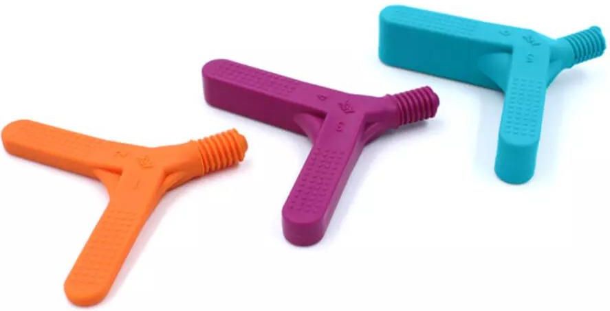 ARK Y-Tongue - Zestaw Szpatułek do Ćwiczeń Żuchwy Y Tip Bite Blocks to zestaw trzech specjalnie zaprojektowanych bloczków do terapii logopedycznej i sensorycznej jamy ustnej. Te innowacyjne końcówki przypominające literę Y zostały stworzone z myślą o treningu kontroli żucia, stabilności żuchwy, zamykania warg oraz dostarczaniu bodźców sensorycznych. 3 bloczki znajdujące się w zestawie różnią się między sobą grubością. Bloczek pomarańczowy jest najcieńszy i ma ramiona o grubości 0,3 cm i 0,5 cm. Nieco grubszy jest bloczek w kolorze magenta, którego ramiona mają grubość 0,76 cm i 1 cm. Najgrubsze ramiona ma bloczek turkusowy (1,27 cm i 1,52 cm). Pozwala to dobrać narzędzie dokładnie do potrzeb pacjenta, a także stopniować trudność ćwiczeń. Każdy z bloczków ma rozmieszczone na ramionach wypustki sensoryczne, dzięki którym możliwa jest dodatkowa stymulacja. Zestaw Y Tip Bite Blocks jest przeznaczony do pracy z dziećmi, młodzieżą i dorosłymi, którzy wymagają terapii logopedycznej i sensorycznej. Bloczki te mogą być wykorzystywane w ćwiczeniach wymowy, ale też m.in. w pracy z pacjentami po porażeniu nerwu twarzowego. Bloczki logopedyczne Y Tip Bite Blocks to wyrób medyczny, zgodny z normami FDA. Końcówki bloczków zgryzowych Y Tip Bite Blocks są kompatybilne z wibratorem logopedycznym Z-Vibe i Z-Grabber, co jeszcze bardziej rozszerza możliwości ich stosowania. [ikony-produktu-opisy] Pomysły na zabawę Ćwiczenia kontroli żucia – angażowanie mięśni żucia, nauka kontroli ruchów mięśni jamy ustnej, rehabilitacja żuchwy Ćwiczący umieszcza bloczek między przedtrzonowcami po jednej stronie ust. Logopeda prosi dziecko/pacjenta o zaciskanie zębów na bloczku i utrzymanie tego położenia przez 5-10 sekund.Ćwiczenie jest powtarzane po drugiej stronie ust. Ćwiczenia zamykania warg – trening kontroli warg, element terapii wymowy, praca nad właściwą pozycją żuchwy Logopeda prosi ćwiczącego o umieszczenie bloczka między przedtrzonowcami po jednej stronie ust i zaciskanie warg na bloczku.Następnie dziecko/pacjent otwiera i zamyka usta 5-10 razy, starając się utrzymać właściwą pozycję żuchwy i jej rytmiczny ruch.Ćwiczenie jest powtarzane po drugiej stronie ust. Co zawiera? 3 bloczki logopedyczne w kształcie litery Y o różnych grubościach. Każde ramię bloczków ma długość około 4 cm i szerokość 1 cm, grubości ramion są różne dla każdego koloru bloczka: bloczek pomarańczowy z ramionami o grubościach 0,3 cm i 0,5 cm bloczek w kolorze magenta z ramionami o grubościach 0,76 cm i 1 cm bloczek o turkusowy z ramionami o grubościach 1,27 cm i 1,52 cm Główne informacje Materiał: tworzywo klasy medycznej, zgodne z wymogami FDA, nie zawiera BPA, PVC, ołowiu, ftalanów i lateksu Możliwość mycia w zmywarce Podczas korzystania z bloczków logopedycznych konieczny jest nadzór osoby dorosłej Instrukcja