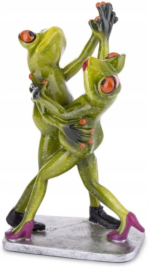 Figurka Żaby W Tańcu Figurka przedstawia dwie urocze żaby, które tworzą taneczną parę. Oba płazy stoją na swoich tylnych łapach i trzymają się za przednie łapki, tworząc elegancki układ taneczny. Ich ciała są zielone, a oczy świecą w radości i ekscytacji związanej z tańcem. Figurka ta to doskonały dodatek dekoracyjny, który może być umieszczony na półce, stole, regale lub komodzie. Przenosi atmosferę tańca i radości do przestrzeni, w której jest umieszczona, i może być inspiracją do tańca i zabawy. To także świetny prezent dla miłośników tańca lub osób, które cenią sobie ozdoby przedstawiające radosne i zabawne sceny. Wysokość: 18,3 cm Szerokość: 11,2 cm Głębokość: 6,8 cm Materiał: Poliresing - mieszanka alabastru, masy żywicznej oraz gipsu Kolor: Wielokolorowy Przesyłka: Paczka - doręczenie z wniesieniem Kod produktu: 137229 Ta urocza figurka została wytworzona z trwałego poliresingu i pomalowana w pięknych kolorach, co nadaje jej nie tylko wyjątkowego uroku, ale także trwałości. Wzorzyste kolory doskonale komponują się ze szczegółami tej scenki, podkreślając delikatność i piękno chwili, którą przedstawia.