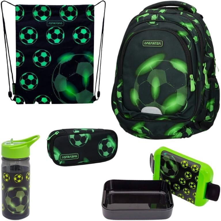 Zestaw Szkolny Astra Plecak + Worek + Piórnik Saszetka + Śniadaniówka + Bidon Marka: AstraMotyw: Neo FootballPlecak: wymiary 39 × 28 × 15 cm, materiał plecaka: wodoodporny, liczba komór w plecaku: 3, liczba kieszeni bocznych w plecaku: 2Piórnik: wymiary piórnika: 22 x 9 x 5 cmWorek: materiał worka: trwały poliester, sznurki w worku: podwójne, ze złączką bezpieczeństwa, wymiary worka: 40 × 33 cmBidon: wymiary bidonu: 6,8 x 8,5 x 19,5, pojemność bidonu: 450 ml, materiał: bezpieczne tworzywo, BPA FREE, przystosowane do kontaktu z żywnościąŚniadaniówka: wymiary śniadaniówki: 16,8 x 11,6 x 6 cm, pojemność śniadaniówki: 450 ml, materiał: bezpieczne tworzywo, BPA FREE, przystosowane do kontaktu z żywnością