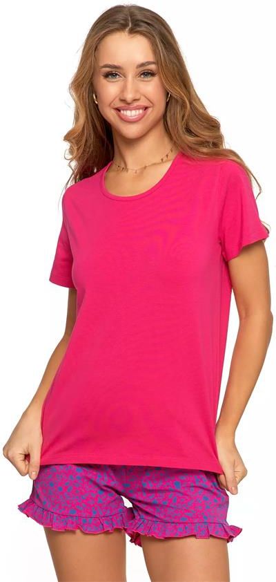 PIŻAMA DWUCZĘŚCIOWA DAMSKA KRÓTKI RĘKAW SPODENKI FALBANKA MORAJ L Lekka i przewiewna piżama damska, która łączy komfort z kobiecym stylem. Gładka koszulka z krótkim rękawem w intensywnym różowym kolorze zapewnia wygodę i swobodę ruchów dzięki miękkiej bawełnie z dodatkiem elastanu. Krótkie szorty w …