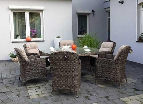 Wszystkie wybarwienia mebla, fotel oraz stół można zobaczyć na ekspozycji sklepu stacjonarnego. BelGiardino - meble ogrodowe z technorattanuDzięki zdobytemu na przestrzeni lat doświadczeniu jesteśmy w stanie dostarczyć główne elementy aranżacji ogrodów, tarasów oraz balkonów. Z roku na rok staramy się dopracowywać naszą kolekcję, odpowiadając na potrzeby klientów i zmieniające się trendy. Polecamy wysokiej jakości meble ogrodowe z technorattanu, które w każdej chwili dostosować można do aktualnych potrzeb. Skład kompletu jeden stół okrągły z blatem z hartowanego szkła o grubości 5mm; sześć foteli z poduszkami w kolorze BEŻOWY SZARY i o grubości 5cm; opcjonalne dwa dodatkowe fotele; opcjonalny dodatkowy pokrowiec w kolorze GRAFIT. Zalety kompletu odporność na działanie promieni UV; odporność na warunki atmosferyczne; elegancka plecionka; niepowtarzalne wzornictwo; wzmocniona konstrukcja stelaża; rama aluminiowa, malowana proszkowo; dodatkowe wzmocnienia zapewniają długotrwałą wygodę i komfort użytkowania mebli ogrodowych. Materiały i wykonanieKomplet mebli ogrodowych ZEUS 160 marki BelGiardino jest wykonany z PÓŁOKRĄGŁEGO technorattanu w kolorze BRĄZOWY MAT i o grubości 6mm, który jest doskonałą imitacją naturalnego rattanu. lekkie stelaże są wykonane z aluminium malowanego proszkowo; konstrukcja mebli ogrodowych jest ręcznie opleciona wspomnianym rattanem PE, co potęguje efekt naturalności; technorattan cechuje się wyjątkową lekkością oraz wytrzymałością na warunki atmosferyczne, takie jak deszcz i śnieg; dzięki zastosowaniu nowego, syntetycznego materiału uzyskano doskonałą jakość oraz wytrzymałość; w komplecie znajdują się poduszki, które wytworzono z wodoodpornego materiału. Zapewniają one komfortowe użytkowanie zestawu; wszystkie pokrowce na poduszki są zaimpregnowane, dzięki czemu są odporne na warunki atmosferyczne oraz poplamienia, dzięki czemu przypadkowo wylane napoje nie stanowią już żadnego problemu; zastosowany zamek błyskawiczny daje możliwość szybkiego zdjęcia i wyczyszczenia każdej poszewki. UwagaW wyniku działania promieni słonecznych oraz wysokich temperatur może występować efekt "falującego" rattanu na blacie stołu. Dzieje się tak z powodu skupiania energii słonecznej przez szybę. Efekt ten jest odwracalny - obniżenie temperatury skutkuje natychmiastowym powrotem do pierwotnego stanu. Zalecamy ustawić zestaw pod zadaszeniem lub w zacienionym miejscu.