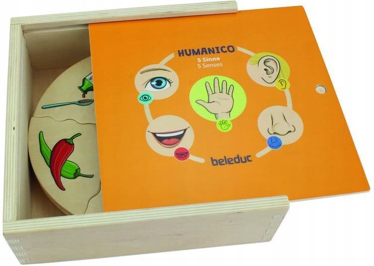 Dla kogo? Humanico – 5 zmysłów to zabawka edukacyjna, drewniane puzzle, która polega na dopasowaniu obrazków do danego zmysłu. Taka zabawa doskonale wpływa na rozwój wyobraźni Twojego dziecka. Jest ona ważnym elementem rozwoju, ponieważ sprawia, iż maluch nie wstydzi się, znajduje niecodzienne rozwiązania oraz eksperymentuje. Podczas zajęć z grą 5 zmysłów najmłodsi jednocześnie wspierają swój prawidłowy rozwój oraz zdobywają nową wiedzę o świecie. Takie puzzle mogą być świetną formą treningu zmysłów; poprzez wykorzystanie przedmiotów codziennego użytku lub przez wyjście na świeże powietrze. Odpowiednia integracja sensoryczna warunkuje prawidłowe funkcjonowanie całego organizmu. Produkt przeznaczony dla dzieci już od 3 roku życia. Dlaczego warto? Zdobywanie wiedzy o świecie Najlepszą formą dotarcia do dziecka jest nauka poprzez zabawę, dzięki czemu dziecko jest stale zainteresowane tym, co się mu przekazuje. Odpowiednia rozmowa gwarantuje poczucie wysłuchania oraz motywacji do działania. Maluch samodzielnie i w swoim tempie przyswaja nowe wiadomości. Dzięki temu ma szanse się wykazać. Podczas gry w 5 zmysłów zadaniem uczestnika jest dopasowanie obrazków do konkretnego zmysłu. Dla maluszków jest to nie lada wyzwanie, podczas którego wykorzystuje się logiczne myślenie. Dobrze rozwinięte logiczne myślenie wykorzystuje się podczas nauki matematyki. Jeżeli dodatkowo angażują się w zajęcia inne osoby, rozwijana jest umiejętność prowadzenia rozmowy (poszerzenie zasobu słownictwa, nauka opisywania emocji), wytrzymania określonego poziomu frustracji (oczekiwanie na swoją kolej), przyjmowania perspektywy drugiej osoby oraz rozwiązywania sytuacji spornych. Doskonalenie integracji sensorycznej Integracja sensoryczna to nic innego jak prawidłowe rozpoznawanie oraz interpretowanie – przez zmysły – napływających do mózgu bodźców. Aby zmysły dziecka prawidłowo ze sobą współdziałały, warto wspomagać jego rozwój już od pierwszych chwil życia. W tej roli doskonale sprawdzą się wspólne zabawy z opiekunem. Humanico – 5 zmysłów to zabawka, która polega na dopasowaniu obrazków do danego rysunku zmysłu, a następnie opisaniu ich. W celu urozmaicenia zabawy, warto wprowadzić prawdziwe przedmioty, na przykład: do zmysłu smaku można wykorzystać owoc, kosztujemy go, a następnie opisujemy smak (słodki, kwaśny itp.). Takie zajęcia nie tylko wspomagają prawidłowy rozwój, ale również zapobiegają powstawaniu zaburzeń. Rozwój wyobraźni Wyobraźnia sprawia, iż dziecko jest otwarte na siebie oraz innych, nie wstydzi się, tworzy nowe ciekawe rzeczy oraz znajduje niekonwencjonalne rozwiązania zadań. Dlatego wspieranie kreatywności od najmłodszych jest tak istotne. Decydując się na naszą grę Humanico – 5 zmysłów jesteś w stanie zagwarantować dziecku mnóstwo zwariowanych kombinacji zabaw. Mogą to być zajęcia na zewnątrz lub wykorzystanie tego, co ma się pod ręką. W zestawie jest aż 30 puzzli, dzięki czemu Twoje dziecko nigdy się nie znudzi. Zamknięte w wygodnym pudełku Zestaw 30 puzzli został zamknięty w wygodnym i kompaktowym pudełku. Dzięki temu nauczysz swoją pociechę porządku, każdy element ma swoje miejsce i należy go schować do pudełka. Takie rozwiązanie jest doskonałe dla osób, które szybko gubią przedmioty. Już nie musisz się obawiać o zatracenie większości elementów po zakamarkach pokoiku dziecięcego czy Twojego gabinetu terapeutycznego. Co zawiera? W zestawie jest 30 drewnianych puzzli, instrukcja oraz plansza aktywności. Główne informacje Materiał: drewno. Wiek: 3+. Wymiary: 18 x 18 x 0,6 cm.