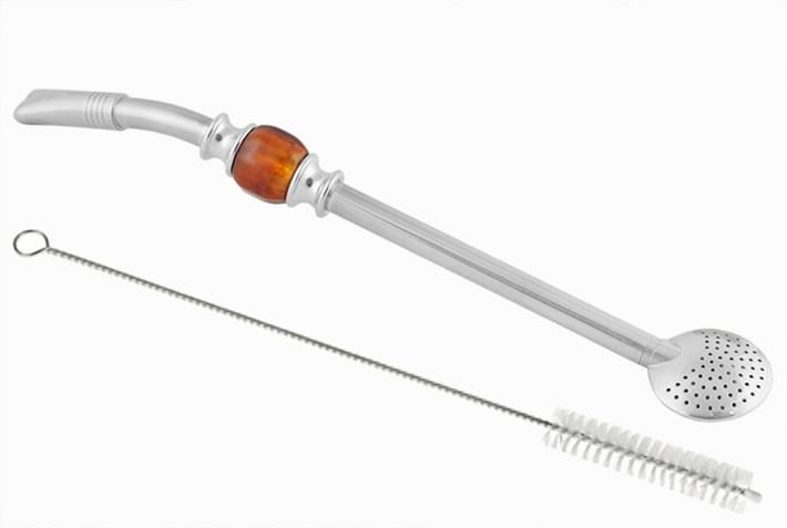 Wzorowana na brazylijskich bombillach, wytworzona w Chinach rurka o solidnej, masywnej konstrukcji. Posiada nieco węższy filtr w porównaniu do oryginału, bo szeroki "tylko" na 3 cm. Poniżej ustnika znajduje się ozdobnik z tworzywa sztucznego, imitujący naturalny bursztyn. Dodatkowo tą nierdzewną bombillkę można rozkręcać, co ułatwia dbanie o jej czystość. Do bombilli dołączony jest wyciorek, który pomoże Ci utrzymać w czystości wnętrze rurki.