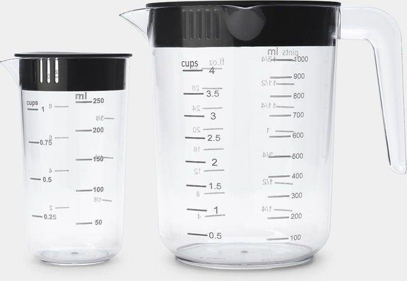Główne zalety: Zestaw miarek Brabantia TASTY+ zawiera dwa praktyczne pojemniki o pojemności 250 ml i 1 litra umożliwiające precyzyjne dozowanie składników idealny do odmierzania płynów, mąki, cukru lub innych składników do gotowania i pieczenia w domowej kuchni mniejsza miarka jest odpowiednia do mniejszych ilości składników, a większa do przygotowywania ciasta lub sosów czytelna i łatwa do odczytania skala na obu pojemnikach pokazuje objętość w mililitrach, filiżankach, uncjach i litrach praktyczna krawędź do nalewania i zakrętka z otworami umożliwiają precyzyjne nalewanie i odcedzanie bez rozlewania miarki wykonane są z wysokiej jakości tworzywa sztucznego, które jest odporne na uderzenia i bezpieczne w kontakcie z żywnością ergonomiczny kształt ułatwia trzymanie w dłoni i zapewnia wygodne i kontrolowane nalewanie pokrywki pomagają zachować świeżość zawartości, umożliwiając krótkotrwałe przechowywanie żywności zestaw został zaprojektowany tak, aby pojemniki można było ustawiać jeden na drugim, co pozwala zaoszczędzić miejsce w szafce kuchennej nowoczesny design w przezroczystym wykończeniu z czarnymi pokrywkami pasuje do każdego stylu kuchni wszystkie części można myć w zmywarce, co zapewnia łatwą i szybką konserwację bez wysiłku produkt w 100% nadaje się do recyklingu po użyciu i gwarantuje długą żywotność dzięki pięcioletniej gwarancji W zestawie: 1x miarka 1000 ml, 13 x 15,5 cm 1x miarka 250 ml, 7,2 x 12,7 cm Dodatkowe informacje: materiał: plastikowy