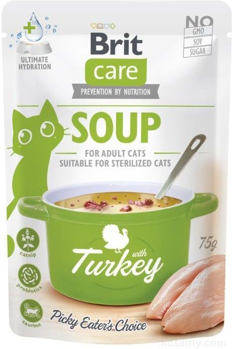 Brit CARE - Hipoalergiczne karmy dla zwierząt Brit Care Cat Soup with Turkey 75g Uzupełniająca bezzbożowa mokra karma dla dorosłych kotów.  Odpowiednia też dla kotów sterylizowanych. Instrukcja dotycząca karmienia: Idealna do uzupełnienia spożycia wody. Może być stosowana jako topper na …