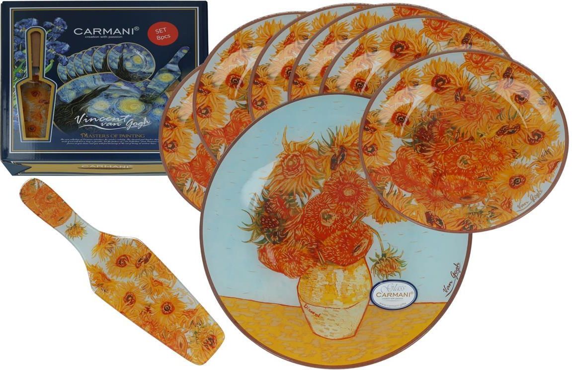 Przedstawiamy... ...Carmani, talerz na ciasto z łopatką + 6x talerzyk deserowy - VAN GOGH/Słone 8-częściowy komplet do ciasta Carmani - van Gogh/Słoneczniki składający się z talerza i łopatki oraz sześciu talerzyków deserowych wykonanych ze szkła borokrzemowego* z naniesionym na powierzchni ładnym …