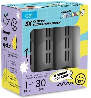 Dafi Power of Lovable – Filtr do butelki Szałwiowe (3 szt.) Zadbaj o czystą i smaczną wodę każdego dnia z zestawem filtrów Dafi Power of Lovable w kolorze szałwiowym. Filtry pasują do butelek filtrujących Dafi SOLID, zapewniając wygodne i ekologiczne korzystanie z wody kranowej. Specyfikacja produktu Typ: filtr węglowy do butelki Dafi Kolor: szałwiowy Ilość w zestawie: 3 sztuki Wydajność: do 1 miesiąca lub ok. 150 l wody na filtr Materiał: węgiel aktywny z łupin orzecha kokosowego Zalety Poprawia smak i zapach wody – usuwa chlor, zachowuje cenne minerały Ekologiczne rozwiązanie – redukuje zużycie plastikowych butelek Łatwa wymiana – szybka i prosta instalacja Wydajność na cały kwartał – zestaw 3 filtrów wystarcza nawet na 3 miesiące użytkowania Filtry Dafi Power of Lovable w kolorze szałwiowym to styl, ekologia i świeża woda zawsze pod ręką – wybierz praktyczne rozwiązanie na co dzień!