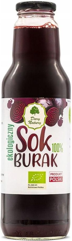 Opis Data, Dary Natury Ekologiczny Sok z buraka 750ml Data Ważności: 01/05/2026 Właściwości Naturalny sok z buraków pochodzących z certyfikowanych plantacji ekologicznych. Doskonały, jako codzienny napój oraz dodatek do tradycyjnego, czerwonego barszczu. Nasze soki wytwarzane są metodą tłoczenia, bez dodatku konserwantów oraz cukru, dzięki czemu stanowią doskonały składnik codziennej diety. Produkt pasteryzowany. Składniki sok z buraka ćwikłowego 100% Wartość odżywcza w 100g produktu Wartość energetyczna: 113 kJ / 27 kcal; Tłuszcz 0,1 g; w tym kwasy tłuszczowe nasycone 0 g; Węglowodany 5,2 g; w tym cukry 3,7 g; Białko 1,2 g; Sól 0,3 g Przechowywanie Przechowywać w suchym i chłodnym miejscu, Po otwarciu przechowywać w lodówce i spożyć w ciągu 72 godzin. Ważne Wytrącający się osad jest naturalnym procesem i nie stanowi wady. Przed spożyciem wstrząsnąć. Objętość netto 750ml Producent/ podmiot odpowiedzialny Dary Natury sp. z o.o. Koryciny 73 17-315 Grodzisk