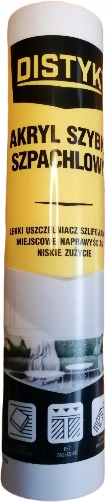 Distyk jest marką grupy Den Braven Czech and Slovak a.s. Distyk Akryl szpachlowy Light&Fast 280ml biały Pojemność: 280 ml Marka: Distyk - Den Braven Do uszczelniania spoin i otworów po wkrętach w konstrukcjach gipsowo-kartonowych, do wypełniania i wyrównywania rys i pęknięć w tynku, murze, betonie, drewnie i gipsie. Kit uszczelniający jest bardzo lekki, łatwo się nakłada, po utwardzeniu łatwo szlifowalny i malowalny. Nie zawiera rozpuszczalników, o wysokiej przyczepności do płyt gipsowo-kartonowych, muru, tynku, drewna i betonu. Idealny do lokalnych napraw krawędzi i uszkodzonych rogów wymagających szlifowania. Do uszczelniania spoin i otworów po wkrętach w konstrukcjach gipsowo-kartonowych, do wypełniania i wyrównywania rys i pęknięć w tynku, murze, betonie, drewnie i gipsie. Kit uszczelniający jest bardzo lekki, łatwo się nakłada, po utwardzeniu łatwo szlifowalny i malowalny. Właściwości, zalety, zastosowanie Bez zawartości rozpuszczalników; Bardzo lekki, szybkoschnący; Kolor biały; Lekki i łatwoszlifowalny po utwardzeniu; Malowanie już po 20 minutach; Malowalny farbami akrylowymi i lateksowymi; Wysoka przyczepność do płyt gipsowo-kartonowych, tynków, drewna, betonu, muru ceglanego itp.;
