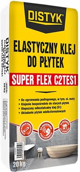 Charakterystyka: Elastyczny klej do płytek Distyk SUPER FLEX C2TE S1 20 kg szaryOdkształcalny klej cementowy o zmniejszonym poślizgu i wydłużonym czasie utwardzania nadający się do najbardziej wymagających warunków. Przeznaczony jest do klejenia okładzin i płytek ceramicznych, klejenia materiałów …