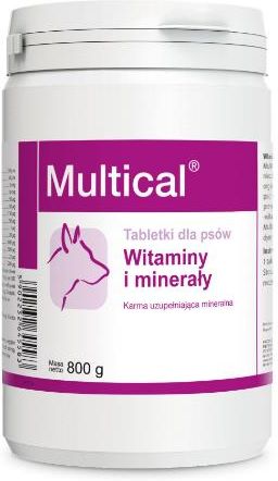 Witaminowo-mineralny preparat dla psów. Karma uzupełniająca mineralna. Właściwości:Multical zawiera witaminy, mikro- i makroelementy, niezbędne do prawidłowego rozwoju i funkcjonowania organizmu psa. Dobrane są one w sposób optymalny pod względem proporcji i ilości. Zawarte składniki poprawiają kondycję, zapobiegają niedoborom mineralno-witaminowym. Multical przeznaczony jest dla psów każdej rasy i w każdym wieku, a szczególnie dla suk w okresie ciąży i laktacji. Skład:Skład 1 kgDodatki w 1 kg Witaminy, prowitaminy i chemicznie dobrze zdefiniowane substancje o podobnym działaniu:Witamina A100 000 j.m.Witamina D310 000 j.m.Witamina E1 000 mgWitamina K20 mgWitamina B120 mgWitamina B244 mgWitamina B620 mgWitamina B12400 µgBiotyna10 000 µgNiacyna230 mgKwas pantotenowy200 mgKwas foliowy10 mgChlorek choliny420 mg Mieszanki pierwiastków śladowych: Żelazo (siarczan żelaza (II) * H2O) 1 500mg, Mangan (tlenek manganu (II)) 100mg, Miedź (siarczan miedzi * 5H2O) 150mg, Cynk (siarczan cynku * H2O) 2 000mg, Jod (jodek potasu) 30mg, Selen (selenian (IV) sodu) 4mg; Dodatki technologiczne: mleczan wapnia; Przeciwutleniacze Składniki analityczne w 1 kg Wapń 200g, w tym z muszli ostryg 70g, Fosfor 100g, Magnez 10g, Sód 9g Skład fosforan dwuwapniowy, suszone drożdże piwne, węglan wapnia z muszli ostryg, węglan wapniowo-magnezowy Skład tabletki Dodatki w 1 tabletce Witaminy, prowitaminy i chemicznie dobrze zdefiniowane substancje o podobnym działaniu: Witamina A250 j.m.Witamina D330 j.m.Witamina E3 mgWitamina C10 mgWitamina K350 µgWitamina B150 µgWitamina B2110 µgWitamina B650 µgWitamina B121 µgBiotyna20 µgNiacyna600 µgKwas pantotenowy500 µgKwas foliowy22 µgChlorek choliny1 200 µgMieszanki pierwiastków śladowych: Żelazo (siarczan żelaza (II) * H2O) 2 500 µg, Mangan (tlenek manganu (II)) 200 µg, Miedź (siarczan miedzi * 5H2O) 300 µg, Cynk (siarczan cynku * H2O) 3 000 µg, Jod (jodek potasu) 75 µg, Selen (selenian (IV) sodu) 22 µg; Dodatki technologiczne: mleczan wapnia; Przeciwutleniacze Składniki analityczne w 1 tabletce Wapń 250 mg, w tym z muszli ostryg 85 mg, Fosfor 125 mg, Magnez 40 mg, Sód 12 mg Skład fosforan dwuwapniowy, suszone drożdże piwne, węglan wapniowo-magnezowy, węglan wapnia z muszli ostryg, tlenek magnezu, mleczan magnezu Skład tabletki mini Dodatki w 1 tabletce mini Witaminy, prowitaminy i chemicznie dobrze zdefiniowane substancje o podobnym działaniu: Witamina A83 j.m.Witamina D310 j.m.Witamina E1 mgWitamina C3,4 mgWitamina K317 µgWitamina B117 µgWitamina B237 µgWitamina B617 µgWitamina B120,34 µgBiotyna6,7 µgNiacyna200 µgKwas pantotenowy167 µgKwas foliowy7,7 µgChlorek choliny500 µg Mieszanki pierwiastków śladowych: Żelazo (siarczan żelaza (II) * H2O) 830µg, Mangan (tlenek manganu (II)) 67µg, Miedź (siarczan miedzi * 5H2O) 100µg, Cynk (siarczan cynku * H2O) 1 000µg, Jod (jodek potasu) 25µg, Selen (selenin sodu) 7,4µg; Dodatki technologiczne: mleczan wapnia; Przeciwutleniacze Składniki analityczne w 1 tabletce mini Wapń 84mg, w tym z muszli ostryg 28mg, Fosfor 42mg, Magnez 13,5mg, Sód 4mg Skład fosforan dwuwapniowy, suszone drożdże piwne, węglan wapnia z muszli ostryg, tlenek magnezu, mleczan magnezu Instrukcja stosowania:Proszek: 1 miarka (5g) na 10 kg ciężaru ciała dziennie Tabletki: 1 tabletka na 10 kg ciężaru ciała dziennie Tabletki Mini: 1 tabletka na 2 kg ciężaru ciała dziennie Stosując u suk ciężarnych i karmiących ilości można podwoić. Zawartość opakowania:500 g, 700 g 90 tabletek, 90 tabletek mini 800 g tabletek pudełko, 1000 g proszek torebka