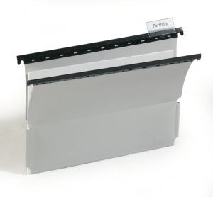 Zawieszana teczka wykonana z polipropylenu zaokrąglona szyna z tworzywa sztucznego jest odporna na obciążenia dokumenty są bezpiecznie umieszczone dzięki bocznym osłonom, które zapobiegają wypadnięciu, a plisowane dno dopasowuje się do pojemności wyposażona w okienko, w którym można umieścić opis przednia okładka posiada zagięcie, które zapewnia szybki i wygodny dostęp do dokumentów kolor szary