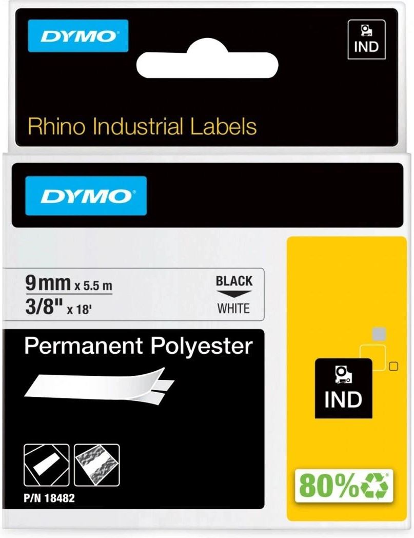 Taśma poliestrowa DYMO Rhino 18482 9 mm x 5,5 m / do drukarek DYMO D1 Taśmy do drukarek Dymo Rhino zapewnią Twoim pracom instalacyjnym profesjonalizm i estetyczny wygląd. Sprawdzają sie nawet w ekstremalnych warunkach. Są odporne na ścieranie, zmiany temperatury, działania środków chemicznych, rozpuszczalników, wody i promieniowania UV. Taśmy dymo Rhino gwarantują trwałe i wysokiej jakości nadruki. Szczególnie przydatne są niezwykle odporne taśmy Rhino wykonane z poliestru.    Taśmy Dymo Rhino poliestrowe 9 mm x 5,5 m w kolorze białym Tego typu taśmy stosuje się na wszystkich powierzchniach: gładkich, chropowatych i bardzo chropowatych. Ważne aby było to powierzchnie płaskie. Charakteryzują się wysoką odpornością na rozpuszczalniki, zmywanie oraz różnorodne substancje chemiczne. Nie blakną, nie łuszczą się i są odporne na promienie UV. Ich mocny klej na długo zapewnia taśmom poliestrowym przyczepność.   Taśm Dymo Rhino poliester nie stosuje się na zakrzywionych powierzchniach i kablach.   Zastosowanie taśm Dymo typu Rhino poliestrowe Taśmy poliestrowe stosuje się w się w szeroko pojętej elektroinstalacji. Możne je naklejać na urządzenia, krosownice, wyposażenie, serwery, szafki, maszyny - wszędzie tam gdzie potrzebny jest mocny klej na płaskiej powierzchni. Numer katalogowy:  18482 Zastosowanie: Etykiety bezpieczeństwa, Gładka powierzchnia, Odporność na czynniki chemiczne, Odporność na oleje, Odporność na promienie UV, Odporność na temperaturę, Odporność na wilgoć, Oznaczenia elektoroinstalacyjne, Zarządzanie magazynem, Zarządzanie zasobami Rozmiar:  9mm Ilość etykiet na rolce: 5,5 Rodzaj taśmy/materiał: poliester Rodzaj kleju: trwały Kolor taśmy: biały   Pasują do drukarek typu Rhino: Dymo Rhino 4200, Dymo Rhino 5000, Dymo Rhino 5200, Dymo Rhino 6000 oraz do zestawów walizkowych wyposażonych w wymienione drukarki.      . .lnd_punkty li::marker { color: #0590b0!important; }