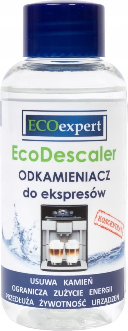 Odkamieniacz do ekspresu EcoDescaler 100 ml koncentrat Wysokiej jakości odkamieniacz w płynie przeznaczony do wszystkich rodzajów ekspresów (ciśnieniowych, przelewowych, kapsułkowych). Jest ekologiczny - stworzony został na bazie kwasów organicznych. Usuwa osad wapienny powstający w wyniku podgrzewania wody, co pozwala na długie, sprawne działanie ekspresu oraz uniknięcie potencjalnych uszkodzeń i kosztownych napraw. Dobrze zakonserwowany i wyczyszczony ekspres zużywa również mniej prądu, a każdy napój smakuje lepiej. Płyn nadaje się do wszystkich ekspresów dostępnych na rynku. Koncentratu używa się w proporcji 1:5 (100 ml odkamieniacza na 500 ml wody). Opakowanie wystarcza na 5 cykli odkamieniania. ---------------------------------------------------- Producent: ECOexpert Pojemność: 100 ml (1 cykl odkamieniania) Składniki: kwas mlekowy, kwas cytrynowy Właściwości: Eliminuje osad z kamienia Przeznaczenie: Ekspresy do kawy