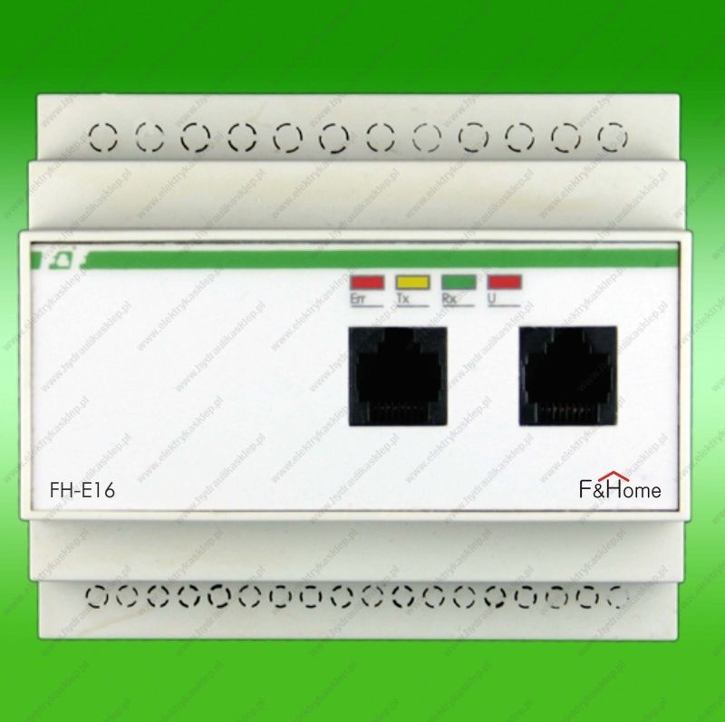 Moduł silnikowy mH-E16 dedykowany jest do sterowania wszelkimi odbiornikami silnikowymi. Nadaje się zarówno do sterowania roletami zewnętrznymi (antywłamaniowymi) zasilanymi silnikami 230V lub 24V, jak również żaluzjami pionowymi i poziomymi. Moduł montowany jest w rozdzielni i zajmuje pole 6 modułów i zasilany jest napięciem 24VDC. Do wejść modułu sprowadzane są przyciski rozlokowane na budynku, podłączona za pomocą przewodów typu UTP. Moduł zarządza silnikami rolet lub żaluzji na zasadzie góra-dół (lub prawo-lewo) za pośrednictwem przekaźnikowych modułów wykonawczych typu mH-R8x8 lub mH-R2x16. Sterowanie odbywa się w pełni po linii niskiego napięcia 24V, co zapewnia pełne bezpieczeństwo i możliwość dowolnego rozmieszczenia przycisków sterujących w budynku. Moduł mH-E16 komunikuje się z panelami dotykowymi poprzez linię CAN. Dowolne wyjście modułu może być wyzwolone z poziomu paneli dotykowych poprzez wybranie konkretnego urządzenia lub sceny (grupy urządzeń). Z poziomu panelu dotykowego istnieje możliwość zaprogramowania czasowego samoczynnego załączania/wyłączania urządzeń lub grup urządzeń sterowanych z modułu wejść/wyjść. W przypadku potrzeby stosowania większej ilości wejść/wyjść można zastosować kilka modułów silnikowych, przy czym należy pamiętać że muszą to być moduły kolejnych poziomów (mH-E16 – poziom 1, mH-E16-poziom 2…). Wejścia/wyjścia Wejścia modułu mH-E16 przystosowane są do podłączenia łączników monostabilnych (dzwonkowych) zasilanych napięciem bezpiecznym 24V. Do sterowania każdego z silników przeznaczone są dwa wejścia (góra/dół lub lewo/prawo). Wyzwolenie wejścia następuje w momencie zamknięcia łącznika i podania +24V na wejście modułu. Wyjścia modułu mH-E16 przystosowane są do współpracy z modułami wyjść przekaźnikowych typu mH-R8x8 lub mHR2x16. Dobór ilości oraz rodzaju modułów przekaźnikowych zależny jest od ilości i wielkości obciążenia odbiorników. Oprogramowanie modułu uniemożliwia jednoczesne załączenie napędów na ruch w obu kierunkach. Moduł mH-E16 oferowany jest w wykonaniu na różne poziomy, umożliwiając w ten sposób rozbudowę sieci wejść/wyjść podłączonych do systemu F&Home. W pierwszej kolejności należy instalować moduł z poziomu 1, następnie z poziomu 2, itd. Każdy z poziomów charakteryzuje się oddzielną numeracją, dzięki czemu zapewniony jest łatwiejszy montaż instalacji. Zestawienie wejść/wyjść dla modułu mH-E16 przedstawione jest w poniższej tabeli. Zasada działania Wejścia modułu podzielone są na pary umożliwiające sterowanie kolejnymi silnikami podłączonym poprzez moduły przekaźnikowe. Wyzwolenie wejścia powoduje załączenie wyjścia odpowiadającego wyzwolonemu wejściu tak długo, jak długo wyzwolone będzie wejście. W oprogramowaniu sterownika zdefiniowany jest maksymalny czas załączenia napędu, jego przekroczenie spowoduje zatrzymanie silnika pomimo zamkniętego łącznika. Wyjścia umożliwiają załączanie poprzez moduły przekaźnikowe mH-R8x8 lub mH-R2x16 obwodów silnikowych. Dla każdego silnika przewidziane są dwa przekaźniki umożliwiające realizację ruchu w dwóch kierunkach, przy czym oprogramowanie modułu uniemożliwia jednoczesne wymuszenie ruchu w dwóch kierunkach. Wyjścia mogą być wyzwalane lokalnie i wtedy przekaźniki załączony będzie tak długo jak załączony będzie łącznik na wejściu (przy czym narzucone jest ograniczenie w postaci maksymalnego czasu załączenia silnika. Dodatkowo wyjścia mogą być wyzwalane zdalnie z panelu dotykowego i wtedy przekaźnik załączany jest na zdefiniowany okres czasu.