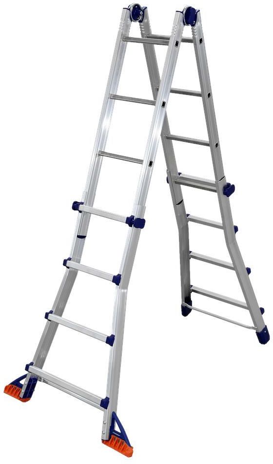 Drabina teleskopowa z funkcją schodową. Może być używana jako wolnostojąca lub opierana o ścianę. Szeroka podstawa zapewnia większą stabilność. Z aluminium.