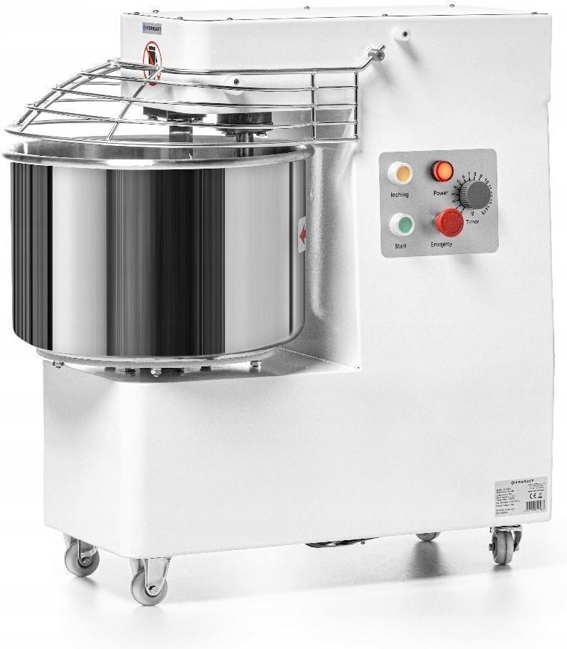 Mikser pochodzi z ekspozycji. Posiada na obudowie drobne rysy. Na tylnej części obudowy oraz z boku widoczne wady produkcyjne- wady malowania. Mikser spiralny (miesiarka) marki Forgast o pojemności dzieży 33 l. Mikser spiralny służy do wyrabiania ciast ciężkich np. na pizzę, pierogi, itp. Urządzenie posiada stały napęd haka oraz dzieży z funkcją biegu wstecznego. Prędkość mieszadła 170 obr./minutę, natomiast dzieży - 17 obr./min. Zarówno dzieża jak i hak wykonane są z wysokogatunkowej stali nierdzewnej. Dla lepszej mobilności mikser wyposażony jest w cztery kółka skrętne, w tym dwa z hamulcem. Uwaga: Mikser pochodzi z ekspozycji. Posiada na obudowie drobne rysy. Na tylnej części obudowy oraz z boku widoczne wady produkcyjne- wady malowania.