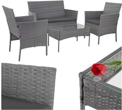 Meble ogrodowe zestaw mebli ogrodowych technorattan na taras sofa stolik Polska marka GARDLOV - meble najwyższej jakości Meble ogrodowe technorattanowe ciemno szary Gardlov - zestaw 2 krzeseł, sofa, stolik ze szkłem i poduszkami Szukasz wygodnego i eleganckiego zestawu mebli do ogrodu, na taras lub …