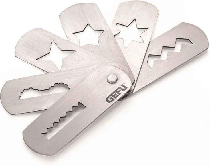 Z nakładkami TRICA przygotujesz pyszne ciasteczka przy użyciu maszynki do mięsa lub urządzenia KitchenAid. Zestaw składa się z 6 wzorów, a każdym z nich wyciśniesz idealny kształt. Cechy szczególne pasują do maszynki do mielenia mięsa TRICA nadaje się również do urządzenia KitchenAid 6 różnych wzorów wykonane z wysokiej jakości stali nierdzewnej można myć w zmywarce Gwarancja 5-letnia gwarancja pod znakiem "Q5-label". GEFU gwarantuje swoim klientom, że produkty są wolne od wad materiałowych, produkcyjnych i projektowych. Wymiary Długość: 5.8 cm 6.9 cm Szerokość: 5.8 cm 6.9 cm Wysokość: 2.2 cm 1.5 cm Masa: 0.05 kg 0.05 kg