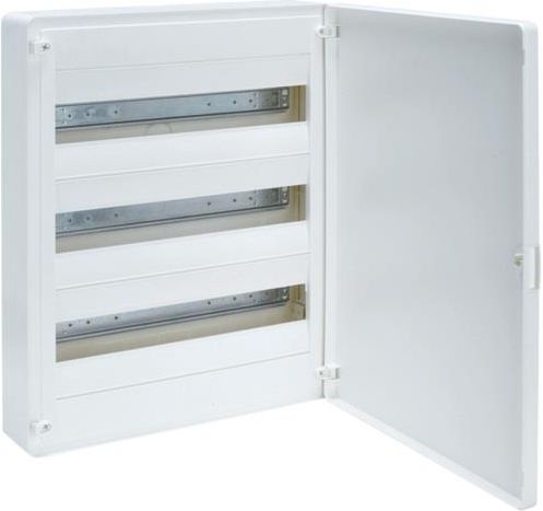 Skrzynka rozdzielcza natynkowa, do aparatów o głębokości zabudowy do 70 mm. obudowa wykonana z tworzywa sztucznego, prosta zamiana drzwi leweprawe, bez konieczności demontażu ramki maskującej, opcjonalnie możliwość zamontowania zamka z kluczem, drzwi otwierane do kąta 180°. Komponenty: mosiężne zaciski śrubowe, zaślepki wolnych miejsc, szyny TS35 montowane bezpośrednio na ścianie tylnej rozdzielnicy umożliwiają dodatkowo prowadzenie za nimi przewodów, wieżyczki do mocowania opasek prowadzących przewody, opcjonalnie uchwyt podtrzymujący przewody, nowy system oznaczeń, drzwi zabezpieczone folią, szafki pakowane w solidnych kartonach. Dane techniczne: Ilość modułów: 54 Liczba rzędów: 3 Listwy zaciskowe N+PE. Stopień ochrony: IP 40 Drzwi białe. Odporność uderzeniowa: IK07 Prąd znamionowy: dla aparatury do 63 A Napięcie znamionowe: AC 400 V / 50 Hz Próba rozżarzonego drutu: 850°C Wymiary [mm]: 500 x 390 x 99