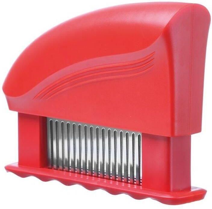 Maszynka do zmiękczania mięsa - niewielki przyrząd przeznaczony do zmiękczania surowego mięsa. Pozwala skutecznie, bez użycia środków chemicznych uszlachetnić i zmiękczyć mięso przeznaczone do pieczenia, smażenia, grillowania. 51 specjalnie zaprojektowanych ostrzy ze stali nierdzewnej wsuwa się przy uderzeniu w płat mięsa, nacinając i delikatnie rozbijając włókna. Stosowanie maszynki pozwala na skrócenie czasu marynowania oraz pieczenia czy grillowania, a mięso znacznie mniej się kurczy. Kolor czerwony. Uwaga: Można myć w zmywarce.