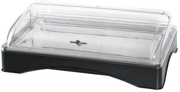 Taca chłodzona z pokrywą prostokątną. Przezroczysta pokrywa typu rolltop wykonana z poliwęglanu. Podstawa - tworzywo ABS. W zestawie znajduje się taca GN 1/1 ze stali nierdzewnej oraz jeden element chłodzący, który można schładzać do temperatury poniżej 0oC.
