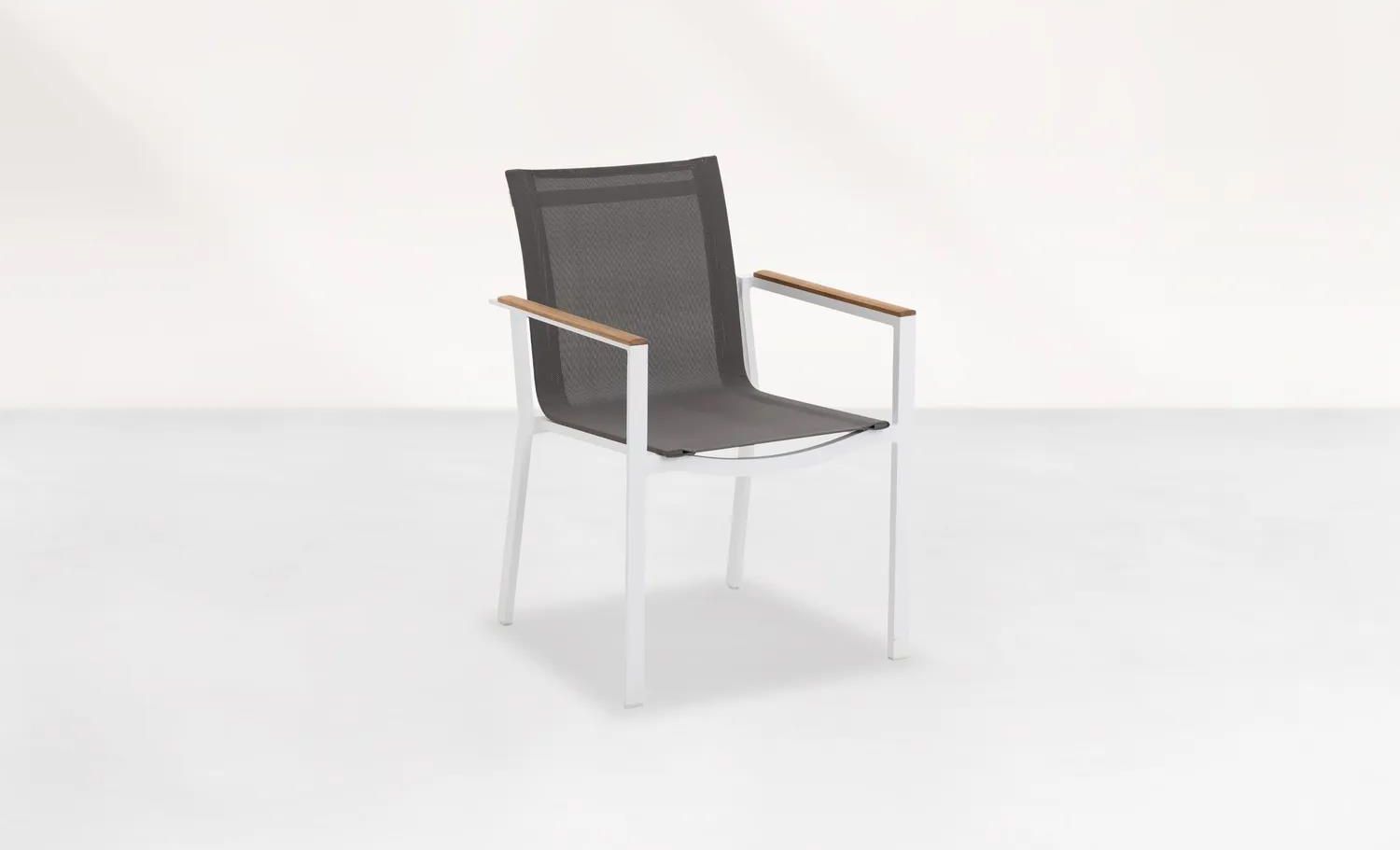 Krzesło sztaplowane Primavera White Teak Kolor: aluminium - białe tekstylina - taupe Materiał: konstrukcja krzesła aluminiowa siedzisko i oparcie - tekstylina podłokietniki - teak Wymiary: szerokość: 59cm głębokość: 60cm wysokość: 86.5cm