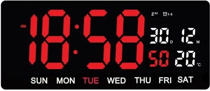 Zegar ścienny budzik sieciowy z czerwonymi cyframi LED i termometrem. Długość 36 cm. Cyfry 10 cm. Alarm / budzik. Duży budzik zegar stołowy szafkowy do biura pokoju salonu. Dni tygodnia w języku angielskim