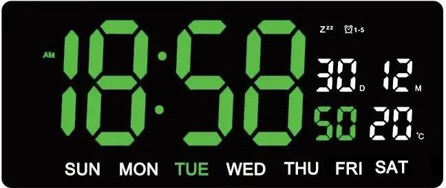 Zegar ścienny budzik sieciowy z zielonymi cyframi LED i termometrem. Długość 36 cm. Cyfry 10 cm. Alarm / budzik. Duży budzik zegar stołowy szafkowy do biura pokoju salonu. Dni tygodnia w języku angielskim