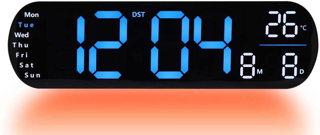 Zegar ścienny z pilotem, budzik sieciowy z niebieskimi cyframi LED, termometrem, stoperem, timerem. Długość 35 cm. Cyfry 7,5 cm. Alarm / budzik. Duży budzik zegar stołowy szafkowy do biura pokoju salonu. Dni tygodnia w języku angielskim