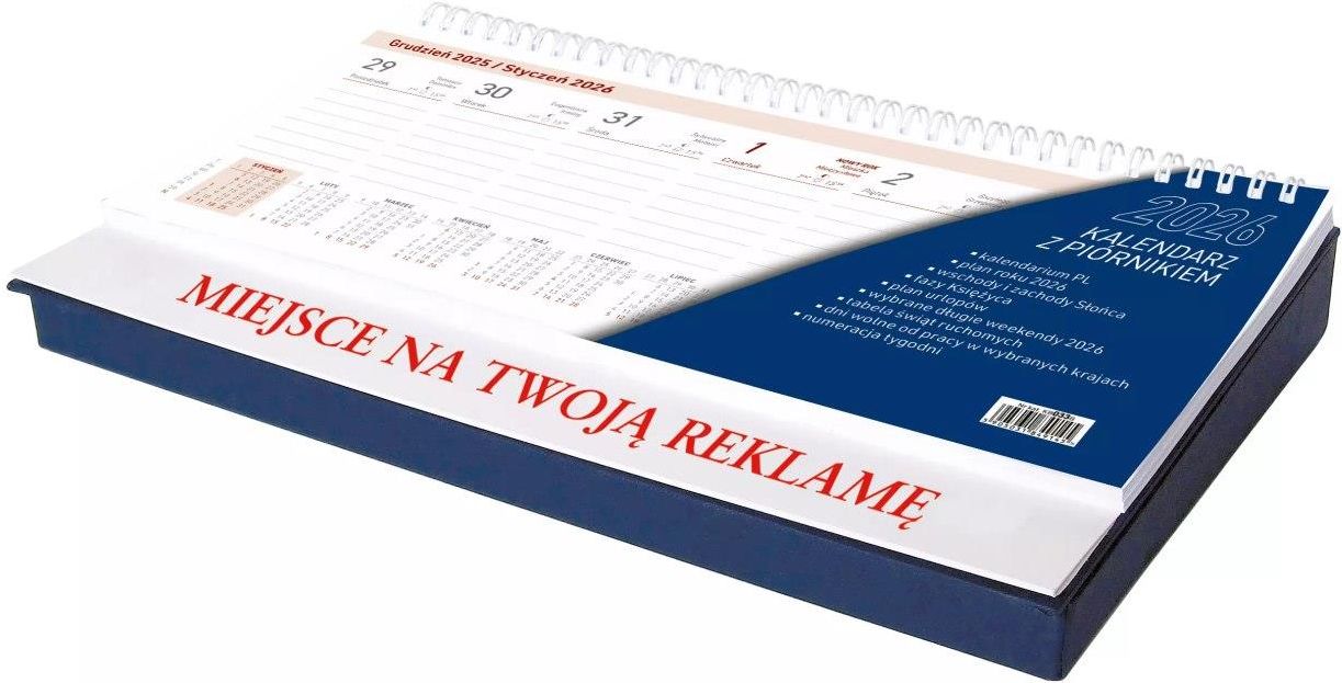 Kalendarz biurkowy z piórnikiem 2026 Praktyczny kalendarz biurkowy z piórnikiem z przejrzystym kalendarium w układzie tygodniowym, z dużym obszarem do notowania. Piórnik wykonany z tektury. Istnieje możliwość wykonania nadruku reklamowego pod kalendarium na obszarze o wymiarach 29.7 x 3.5 cm. Istnieje możliwość założenia indywidualnej okładki. W kalendarzu zaznaczono święta i daty imienin. W dolnej części kalendarium podgląd skróconego kalendarium bieżącego roku.Część informacyjna kalendarza zawiera: • kalendarium 2025, 2026, 2027, • plan roku 2026, • plan urlopów, • długie weekendy 2026, • tabela świąt ruchomych 2026, • dni wolne od pracy w wybranych krajach, • fazy Księżyca, • wschody i zachody Słońca, • daty imienin. Praktyczny kalendarz biurkowy z piórnikiem z przejrzystym kalendarium w układzie tygodniowym, z dużym obszarem do notowania. Piórnik wykonany z tektury. Istnieje możliwość wykonania nadruku reklamowego pod kalendarium na obszarze o wymiarach 29.7 x 3.5 cm. Istnieje możliwość założenia indywidualnej okładki. W kalendarzu zaznaczono święta i daty imienin. W dolnej części kalendarium podgląd skróconego kalendarium bieżącego roku.Część informacyjna kalendarza zawiera: • kalendarium 2025, 2026, 2027, • plan roku 2026, • plan urlopów, • długie weekendy 2026, • tabela świąt ruchomych 2026, • dni wolne od pracy w wybranych krajach, • fazy Księżyca, • wschody i zachody Słońca, • daty imienin.