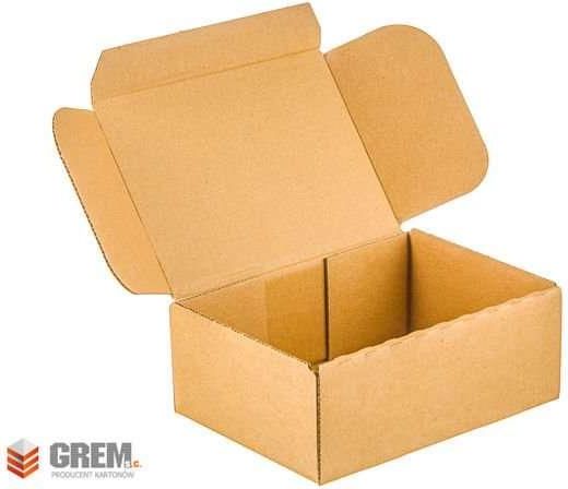 Komplet 10 szt. szarych pudeł kartonowych fasonowych o wymiarach zew. 200x150x80 mm (dł/szer/wys). Opakowania wykonane są z trzywarstwowej tektury falistej (fala B) o gramaturze 380 g/m2.