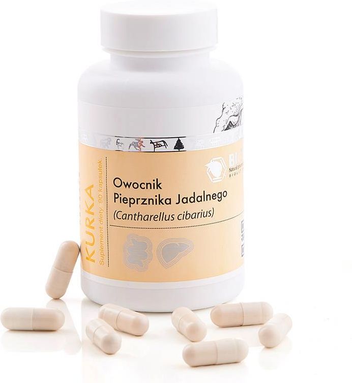 Sproszkowany owocnik pieprznika jadalnego. Produkt zawiera sproszkowany owocnik pieprznika jadalnego znanego jako kurka, łac. Cantharellus cibarius. Kurka występuje w Europie od Skandynawii po Morze Śródziemne; jeden z najczęściej zbieranych grzybów w polskich lasach. Kurki żyją w symbiozie z sosną, świerkiem, dębem i grabem. Jedne z nielicznych grzybów, które spotykamy i zbieramy ze środowiska naturalnego jako zdrowe, bez infekcji robaczych. Cenione ze względu na aromat, smak, i jędrność. Ingredients/składniki: owocnik pieprznika jadalnego Cantharellus cibarius Fungus Fructus proszek zmikronizowany. Zawartość składników wykazujących efekt fizjologiczny w dziennej porcji produktu – 6 kapsułek: pieprznik jadalny proszek zmikronizowany – 1800 mg. Dla osób, które poszukują wsparcia odporności organizmu. Dla osób szukających suplementu diety wspomagającego prawidłowe funkcjonowanie układu trawienia. Dla osób poszukujących produktu na bazie adaptogenów. Dwie kapsułki trzy razy dziennie do posiłku, popijać wodą. Produkt przeznaczony dla dorosłych. Spożywanie produktu jest niewskazane w okresie ciąży i karmienia. Suplement diety nie może być stosowany jako substytut (zamiennik) zróżnicowanej diety. Przechowywać w sposób niedostępny dla małych dzieci w suchym miejscu, w temperaturze pokojowej. Chronić przed dostępem światła. Osoby ze stwierdzoną nadwrażliwością na składniki produktu, nie powinny go spożywać. Zaleca się nie łączyć produktu z innymi grzybami.