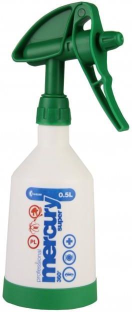 Opryskiwacze z serii Mercury Pro+ Super 360 przeznaczone są aplikacji środków chemicznych na małych powierzchniach. Opryskiwacze Mercury Pro+ Super 360 charakteryzują się podwyższoną odpornością na preparaty o odczynie kwaśnym i zasadowym Unikalna konstrukcja pompki Double Action w połączeniu z systemem 360 umożliwia aplikację środków chemicznych zarówno po naciśnięciu jak i zwolnieniu dźwigni pompki bez względu od położenia zbiornika opryskiwacza. Dzięki temu rozwiązaniu spryskiwacz Mercury Pro+ Super 360 jest bardziej wydajny od klasycznych spryskiwaczy z pompką jednokierunkową. Pompka spryskiwacza zakończona jest dyszą regulowaną, dzięki której z łatwością można ustawić żądany stopień rozpylenia cieczy, do strumienia ciągłego. Elastyczna rurka ssąca opryskiwacza zakończona jest obciążeniem. Pozwala to na aplikację cieczy w każdym położeniu opryskiwacza. Opryskiwacze Mercury Super Pro+ 360 wyposażone są w podstawę stabilizacyjną pełniącą również rolę izolacji zbiornika od podłoża. Podstawa stabilizacyjna może również służyć do kodyfikacji spryskiwaczy kolorem w zależności od odczynu stosowanych preparatów lub strefy sprzątania. Zbiornik opryskiwacza wyposażony jest w pasek poziomu cieczy. Spryskiwacze Mercury Pro+ są idealnym rozwiązaniem dla firm sprzątających, myjni samochodowych, warsztatów samochodowych, czy do użytku domowego. Najlepiej sprawdzają się podczas pracy na małych powierzchniach takich jak meble, okna i szyby samochodowe, deski rozdzielcze, tapicerki, podsufitki, itp.