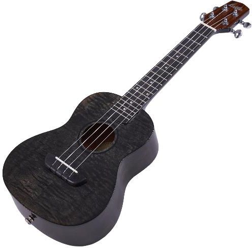 Ukulele koncertowe (23") z serii Woodart design. Płyta wierzchnia: flamed okume. Boki i tył: flamed okume. Gryf: okume. Podstrunnica i mostek: orzech. Maszynki zamknięte, chromowane ( closed die-cast chrome). Binding: abs black. Rozeta: rosette painted black. Logo: pearl inlay. Struny: Aquila. Kolor: transparentny czarny (black transparent glossy). Wykończenie; połysk. Komplet z pokrowcem NEXON TBU-2310 (10mm)