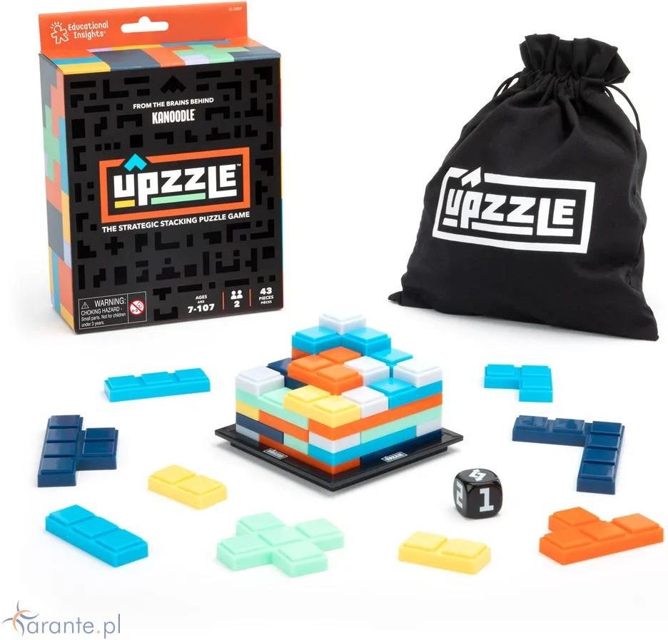 Upzzle – gra logiczna rozwijająca myślenie przestrzenne Upzzle to dynamiczna gra logiczna dla dwóch graczy, która łączy strategie, planowanie i układanie przestrzenne w formie emocjonującego „wyścigu”. Rozgrywka polega na budowaniu konstrukcji na niewielkiej planszy za pomocą specjalnych elementów o różnych kształtach. Gracze kolejno rzucają kostką, a następnie dokładają swoje klocki zgodnie z wylosowanym wynikiem, próbując jak najszybciej wykorzystać wszystkie elementy. Zasady są proste, ale wymagają dużego skupienia i przewidywania. Każdy klocek musi być ułożony stabilnie - elementy nie mogą wystawać poza planszę ani znajdować się nad pustą przestrzenią. To sprawia, że dziecko musi analizować dostępne miejsce, przewidywać konsekwencje kolejnych ruchów i wybierać najlepsze rozwiązania. Gra logiczna Upzzle wymaga także obracania elementów w wyobraźni (rotacji mentalnej) oraz myślenia przestrzennego, ponieważ każdy ruch wpływa na dalsze możliwości budowania. Upzzle - gra logiczna rozwijająca myślenie przestrzenne to świetna propozycja do zabawy w domu, w szkole, w świetlicy oraz podczas zajęć terapeutycznych. Rozgrywka w duecie sprzyja rozwijaniu zdrowej rywalizacji, komunikacji i umiejętności społecznych. Kompaktowy format oraz woreczek do przechowywania sprawiają, że gra idealnie sprawdza się również jako gra podróżna. [ikony-produktu-opisy] Co zawiera? W zestawie znajduje się: Plansza do gry – 1 szt. Elementy Upzzle – 40 szt. Kostka do gry – 1 szt. Woreczek ze sznurkiem do przechowywania – 1 szt. Instrukcja / przewodnik gry Główne informacje Producent: Learning Resources Materiał: tworzywo sztuczne Wymiary: plansza ok. 9,5 × 9,5 cm Certyfikaty: CE Wiek: od 7 roku życia Uwaga: Gra nie powinna być używana przez dzieci poniżej 3 lat – małe elementy = ryzyko uduszenia. Pomysły na zabawę „Wyścig na czas” – trening strategii i planowania, doskonalenie motoryki małej i logicznego myślenia Zagrajcie w grę logiczną Uppzle zgodnie z zasadami: rzut kostką wskazuje, ile elementów należy dołożyć, a wygrywa osoba, która pierwsza pozbędzie się wszystkich swoich klocków. Dziecko musi myśleć kilka ruchów do przodu, planować ustawienie elementów i przewidywać, czy zostawi sobie miejsce na trudniejsze kształty. To świetne ćwiczenie myślenia strategicznego oraz planowania działań. „Budowanie” bez kostki – rozwój wyobraźni przestrzennej, doskonalenie motoryki małej Dla młodszych dzieci lub na zajęciach terapeutycznych można uprościć zasady gry logicznej Uppzle i zrezygnować z kostki. Gracze dokładają po jednym elemencie na zmianę, starając się zbudować jak najwyższą stabilną konstrukcję. Taka forma zabawy pozwala bardziej skupić się na analizie przestrzennej, równowadze i dopasowywaniu elementów. Wspólne budowanie konstrukcji – rozwój umiejętności komunikacyjnych Zamiast rywalizacji możecie zagrać zespołowo: wspólnie budujcie konstrukcję tak, aby wykorzystać wszystkie elementy gry logicznej Uppzle. Dziecko musi omawiać pomysły, argumentować wybór klocka i planować razem z drugą osobą. Taka forma świetnie sprawdza się w edukacji wczesnoszkolnej oraz podczas zajęć rozwijających kompetencje społeczne. Instrukcja
