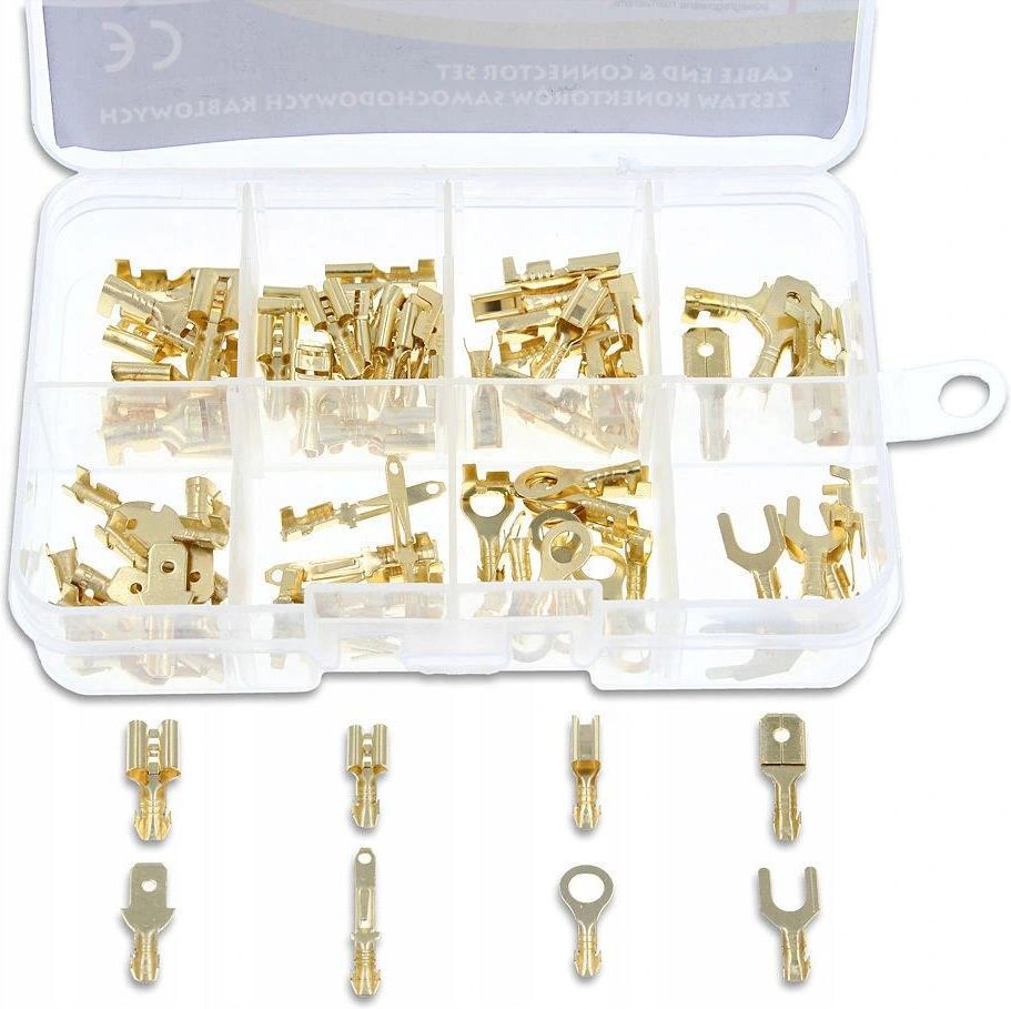 Zestaw konektorów i końcówek ok.80szt + pudełko (EX-1201) Zestaw konektorów, składający się z konektorów męskich, żeńskich, widełkowych i oczkowych, ok. 80-elementów. Konektory są nieizolowane i montowane na kabel. Konektory tego typu są często wykorzystywane w przemyśle i motoryzacji. Zestaw dostarczony jest w solidnym opakowaniu z elastycznego plastiku, Taki organizer umożliwia kontrolę wzrokową, zapobiega mieszaniu się różnych konektorów. Wymiary konektory męskie: 2.8mm, 4.8mm, 6.4mm konektory żeńskie: 2.8mm, 4.8mm, 6.4mm konektor oczkowy: 4.2mm konektor widełkowy: 4.2mm Zachęcamy do zapoznania się z pozostałymi produktami w naszej ofercie