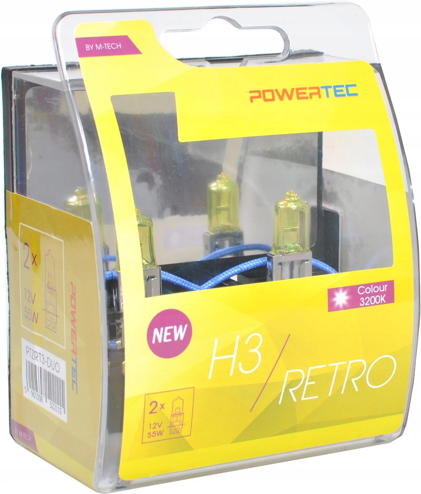 Żarówki halogenowe H3 12V 55W POWERTEC RETRO M-TECH 2szt. ☑️ Żółta barwa 3200K GOLD – lepsza widoczność w deszczu, mgle i śniegu dzięki światłu, które skuteczniej przebija się przez trudne warunki. ☑️ Klasyczny, stylowy wygląd – charakterystyczne żółte światło dodaje pojazdowi wyjątkowego retro-charakteru. ☑️ Ochrona reflektorów dzięki filtrowi UV – szkło kwarcowe zapobiega matowieniu kloszy i wydłuża żywotność lamp. ☑️ Wysoka odporność na temperaturę i drgania – solidna konstrukcja ze stali i hartowanego szkła zapewnia stabilną i długotrwałą pracę. ☑️ Opakowanie DUO – praktyczny i elegancki komplet idealny jako zestaw wymienny lub zapasowy. PowerTec Retro H3 – klasyczna żółta barwa GOLD 3200K Żarówki PowerTec Retro H3 to idealny wybór dla kierowców, którzy chcą połączyć styl z funkcjonalnością. Emitują tradycyjne żółte światło GOLD 3200K, które nie tylko podkreśla atrakcyjny wygląd pojazdu, ale przede wszystkim poprawia widoczność w trudnych warunkach pogodowych. Żółta barwa światła lepiej przebija się przez mgłę, deszcz i śnieg, zwiększając bezpieczeństwo jazdy. Przy produkcji zastosowano hartowane szkło kwarcowe, wysoko gatunkową stal oraz filtr UV, który chroni reflektory i zapobiega matowieniu kloszy. Żarówki są odporne na drgania oraz wysokie temperatury, co przekłada się na długą żywotność i niezawodne działanie. Właściwości ✔️Żółta barwa światła 3200K (GOLD) ✔️Lepsza widoczność w niekorzystnych warunkach pogodowych ✔️Doskonale ustawiona ogniskowa ✔️Szkło kwarcowe z filtrem UV ✔️Wysoka trwałość i odporność na drgania ✔️Podstawa z hartowanej stali ✔️Eleganckie opakowanie DUO Parametry techniczne ✔️Oznaczenie: H3 ✔️Podstawa: PK22s ✔️Moc: 55W ✔️Napięcie: 12V