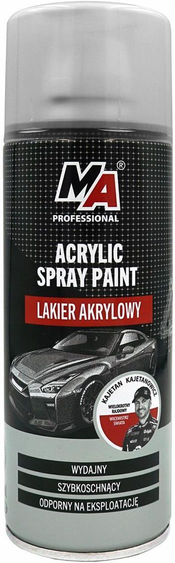 MOJE AUTO LAKIER AKRYLOWY 400ML BEZBARWNY AEROZOL/ MA PROFESSIONAL MOJE AUTO MA Professional - Lakier akrylowy Bezbarwny 400ml MA Professional - Lakier akrylowy bezbarwny 400ml Szybkoschnący lakier akrylowy o bardzo dobrych właściwościach kryjących przeznaczony do malowania różnych powierzchni w tym : drewnianych, metalowych, aluminiowych itp. Może być również stosowany do odnowienia starych powłok lub np. laminatów. Właściwości odporny na zarysowania szybkoschnący Sposób użycia przygotować odpowiednio powierzchnie : odtłuścić, oczyścić i osuszyć zasłonić elementy, których nie chcemy polakierować przez około 2-3 minuty wstrząsać intensywnie pojemnikiem aby farba dokładnie się wymieszała z odległości około 30 cm nanieść 2-3 cienkie warstwy lakieru Zalecenia producenta przed malowaniem wykonać próbę na małej powierzchni w mało widocznym miejscu chronić przed słońcem i nagrzaniem powyżej temperatury +50°C stosować w dobrze wentylowanych pomieszczeniach Opakowanie : spray 400ml