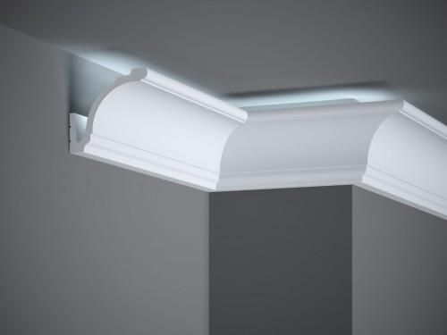 WYMIARY : 200 cm 9,2 cm 8,3 cm Listwa Oświetleniowa MD 161 Mardom Decor Profil odwrócony może być zastosowany jako maskownica karnisza. Oświetleniowa listwa ścienna MD 161 Mardom Decor nawet najbardziej banalne wnętrze zmieni w pomieszczenie oryginalne, wyróżniające się indywidualnym charakterem. Tym, co wyróżnia listwę oświetleniową MD161 jest zastosowanie Technologii LightGuard®, będącej innowacyjnym konceptem firmy Mardom Decor. Największym problemem związanym ze stosowaniem listew oświetleniowych było przebijanie światła przez powierzchnię listwy. Jest to naturalne zjawisko, które w znaczący sposób wpływa na efekt wizualny. Mardom Decor, jako pierwsza firma na rynku, opracowała system eliminowania efektu przebijania światła LED przez powierzchnię listwy. LightGuard® gwarantuje doskonały efekt wizualny podczas stosowania oświetlenia LED. Dzięki tej technologii nie jest konieczne oklejanie listwy taśmą aluminiową, co redukuje czas montażu aż o 80%. Listwy z kolekcji Elite, do jakiej należy sztukateria MD 161 z zastosowaniem odpowiedniego tworzywa, cechują się wysoką odpornością i trwałością, co umożliwia zachowanie walorów użytkowych i wizualnych przez wiele lat. Profil oświetleniowy MD 161 Mardom Decor wykonany jest z tworzywa Polyforce®, dzięki czemu można bezpiecznie stosować go w pomieszczeniach o podwyższonej wilgotności, takich jak łazienki czy kuchnie. Polyforce® to wysokiej jakości, odporna na uszkodzenia odmiana poliuretanu. Listwy z tego tworzywa są lekkie, odporne, gładkie i nie pęcznieją pod działaniem wilgoci. MD161 to listwa LED, która jest bardzo łatwa w docinaniu i instalacji. Nie kruszy się i nie sypie jak styropian. Dekory oświetleniowe MD161 pokryte są białą farbą podkładową, która stanowi wygładzającą bazę pod kolejne warstwy farby. Ważną zaletą tej listwy jest bezproblemowa obróbka i łatwość montażu. Zaczynamy od dokładnego wymierzenia pomieszczenia, po czym starannie odmierzamy i przycinamy listwy. Montaż sztukaterii oświetleniowej MD161 polega na przyklejaniu profili do ściany przy zastosowaniu odpowiedniego kleju montażowego. Również za pomocą właściwego kleju łączymy listwy ze sobą. Do przyklejenia listwy MD161 należy użyć kleju Mardom Decor FIX PRO, zaś do łączenia elementów kleju Mardom Decor FIX EXTRA. Kleje dostępne są w zakładce kleje/akcesoria. Listwy malujemy farbami wodorozcieńczalnymi. Uwaga! Profil sprzedawany jest bez taśmy LED. Listwy oświetleniowe MD161 Mardom Decor mogą nadać wnętrzu delikatny akcent luksusu, mogą wypełnić je elegancką klasyką lub też uczynić nowoczesnym, ale zawsze stworzą nieco tajemniczy, wyjątkowy klimat. Sztukateria oświetleniowa MD161 sprawdzi się w wielu różnych aranżacjach. Montaż sztukaterii ściennej Mardom Decor