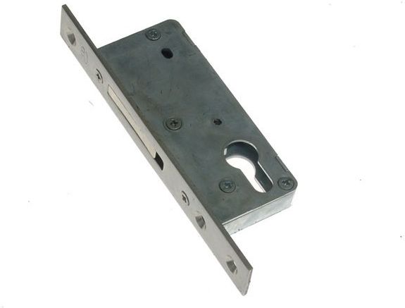 Zamek wpuszczany MC-35S ZASUWKOWY METALPLAST CZĘSTOCHOWA do drzwi z profili aluminiowych i stalowych blacha czołowa INOX 3x22mm dormas 35mm (wymiar od czoła blachy zamka do środka bębenka wkładki) uniwersalny prawy/lewy w komplecie tworzywowe elementy zakańczające klasyfikacja wg: PN-EN 12209-2005