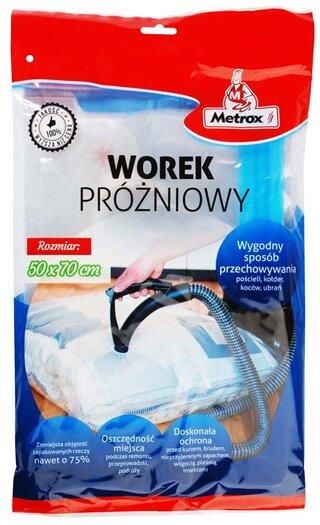 Worek próżniowy 50 cm x 70 cmWorki próżniowe Metrox pozwalają zaoszczędzić do 75% miejsca. Do wykorzystania worka próżniowego wystarczy zwykły odkurzacz, którym wysysamy powietrze z wnętrza worka. Próżniowo można przechowywać kołdry, poduszki, ręczniki i odzież. W specjalnych workach próżniowych z wieszakiem można zamknąć garnitur, smoking czy suknie. Przechowywane w ten sposób rzeczy są idealnie zabezpieczone przed wilgocią, kurzem, roztoczami, insektami i innymi warunkami zewnętrznymi. Worki próżniowe sprawdzą się idealnie w małych pomieszczeniach, podczas wyjazdu na wczasy, w podróży oraz w miesiące letnie kiedy nie korzystamy z garderoby zimowej.Sam worek jest wielokrotnego użytku. Dzięki temu, że jest zamykany na zamek błyskawiczny można go dowolną ilość razy otwierać i zamykać. Powietrze wysysa się przez zawór, który zakręca się korkiem, dzięki czemu jest szczelny i utrzymuje próżnię przez wiele miesięcy. Szczegółowa instrukcja obsługi i wyłączenia z używania umieszczone są na opakowaniu worków.